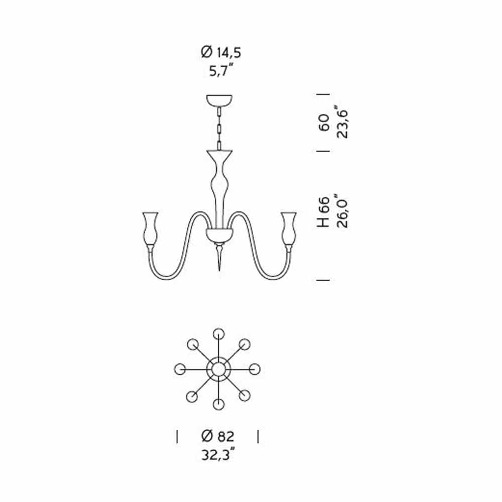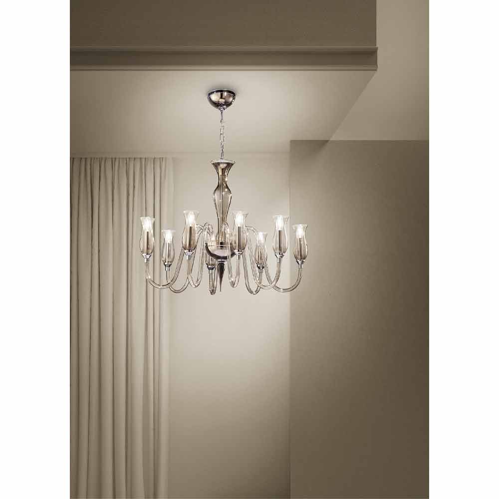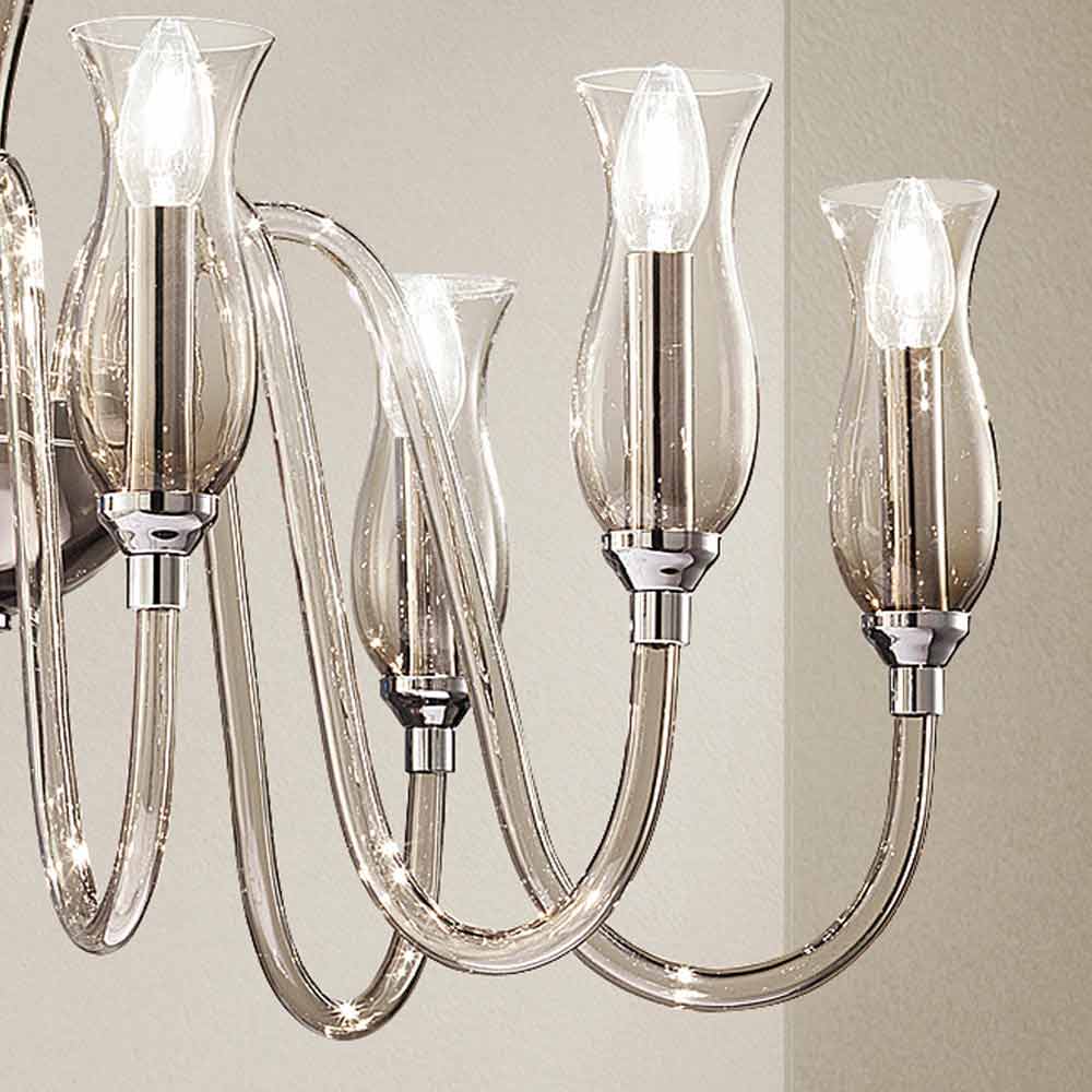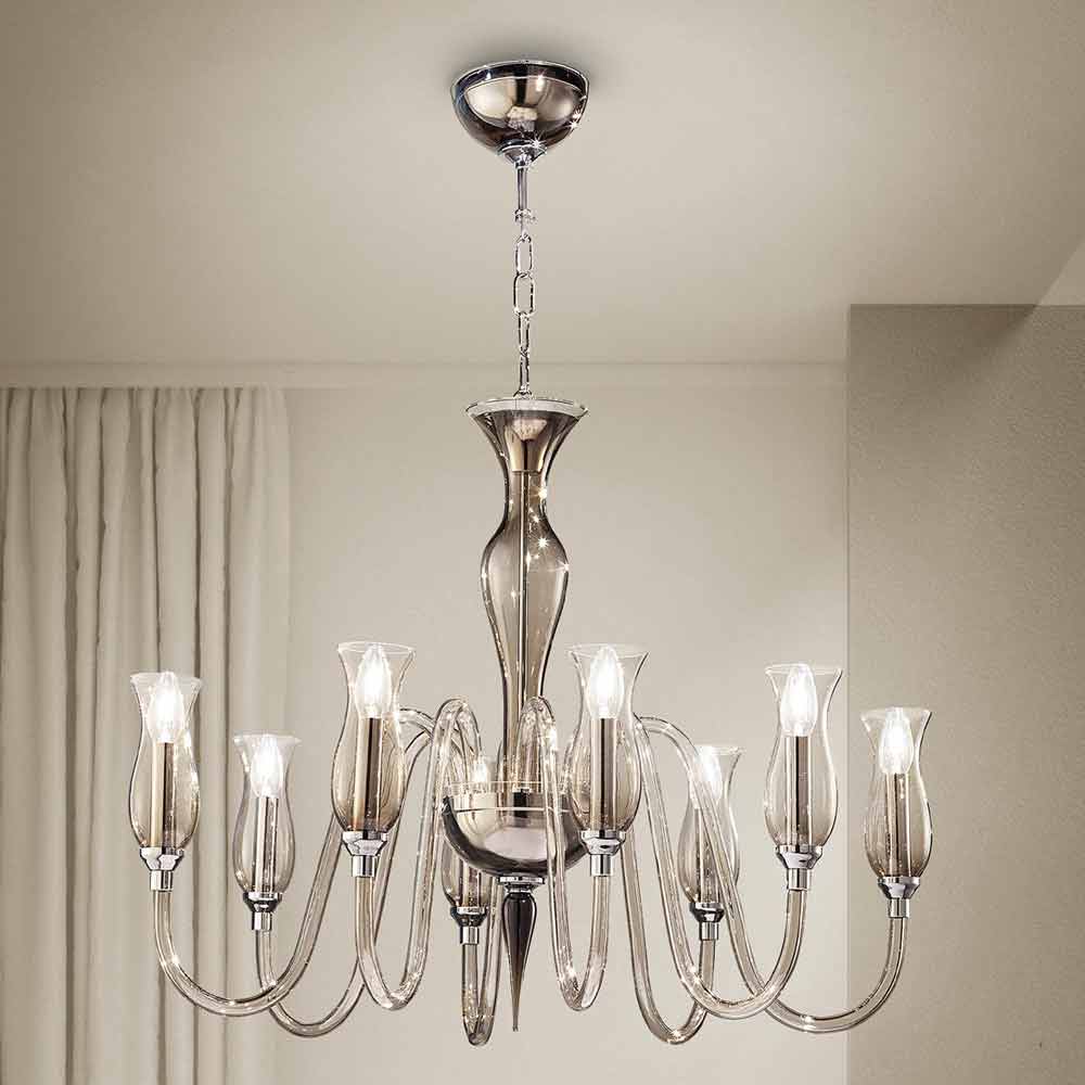 Rafinovaný lustr s osmi světly v ručně vyrobeném benátském skle v kouřovém provedení s detaily z leštěného chromovaného kovu , ručně vyráběný v Itálii. Díky majestátu, který podtrhuje její tvary, se z ní stává protagonista scény, ideální pro umístění do středu místnosti, do obývacího pokoje nebo do velké elegantní ložnice pro sugestivní a romantickou atmosféru. Jeho zvláštnost představuje hladký povrch skla, který zdůrazňuje hru průhlednosti a nádherné zářivé efekty světla pro výsledek se silným vizuálním dopadem.