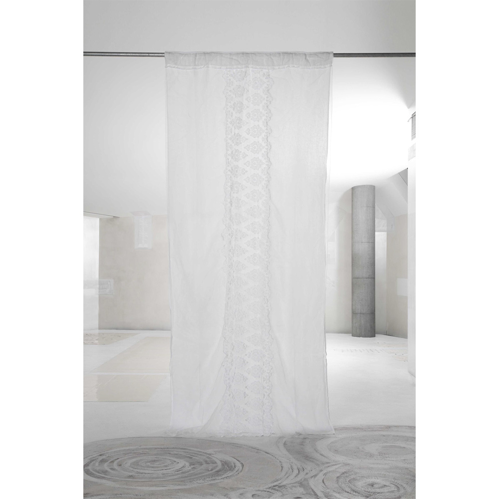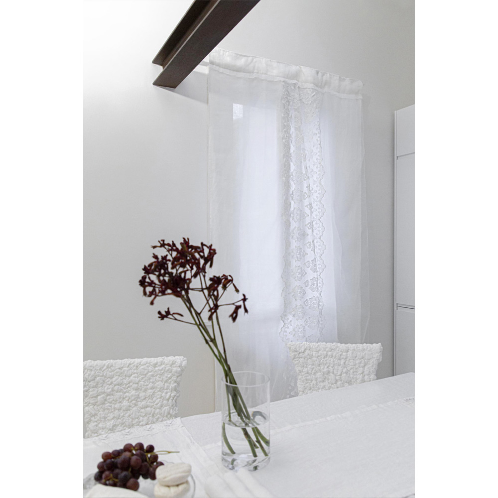 Přírodní plátěný a organzový závěs s centrální svislou výšivkou a predispozicí pro tyč, vyrobený v Itálii.