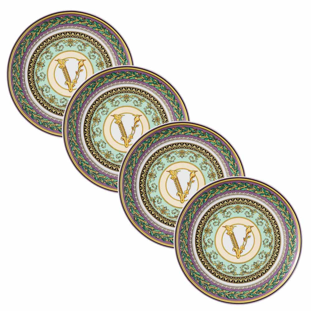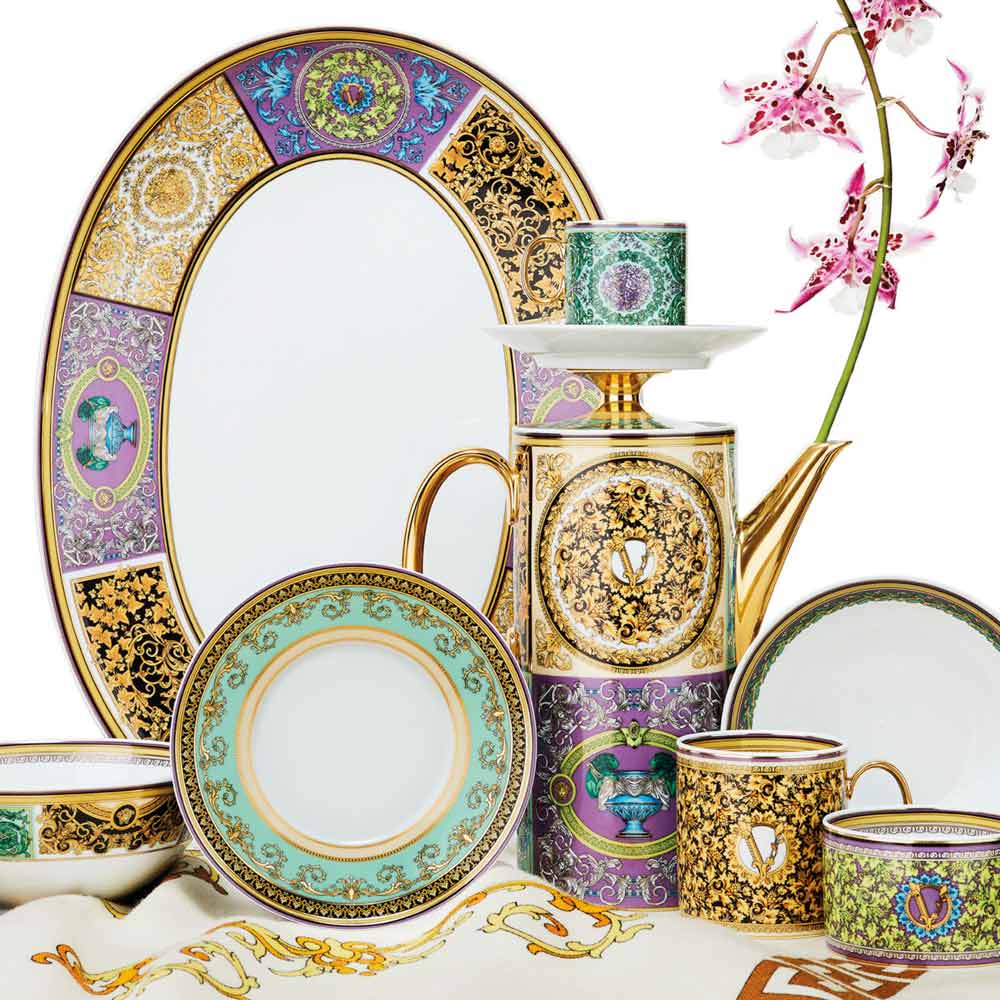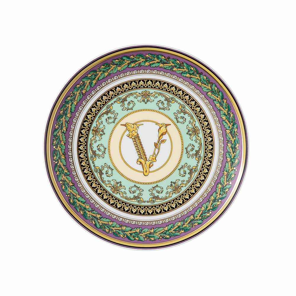 Talíř na chléb Barocco Mosaic od Versace z vzácného porcelánu je kombinací klasické elegance a současného designu. Jeho jedinečný design zdůrazňuje symbol „V“ Virtus obklopený ornamentálními detaily v jiskřivých zlatých a pastelových odstínech, které vytvářejí sofistikovaný a podmanivý efekt.