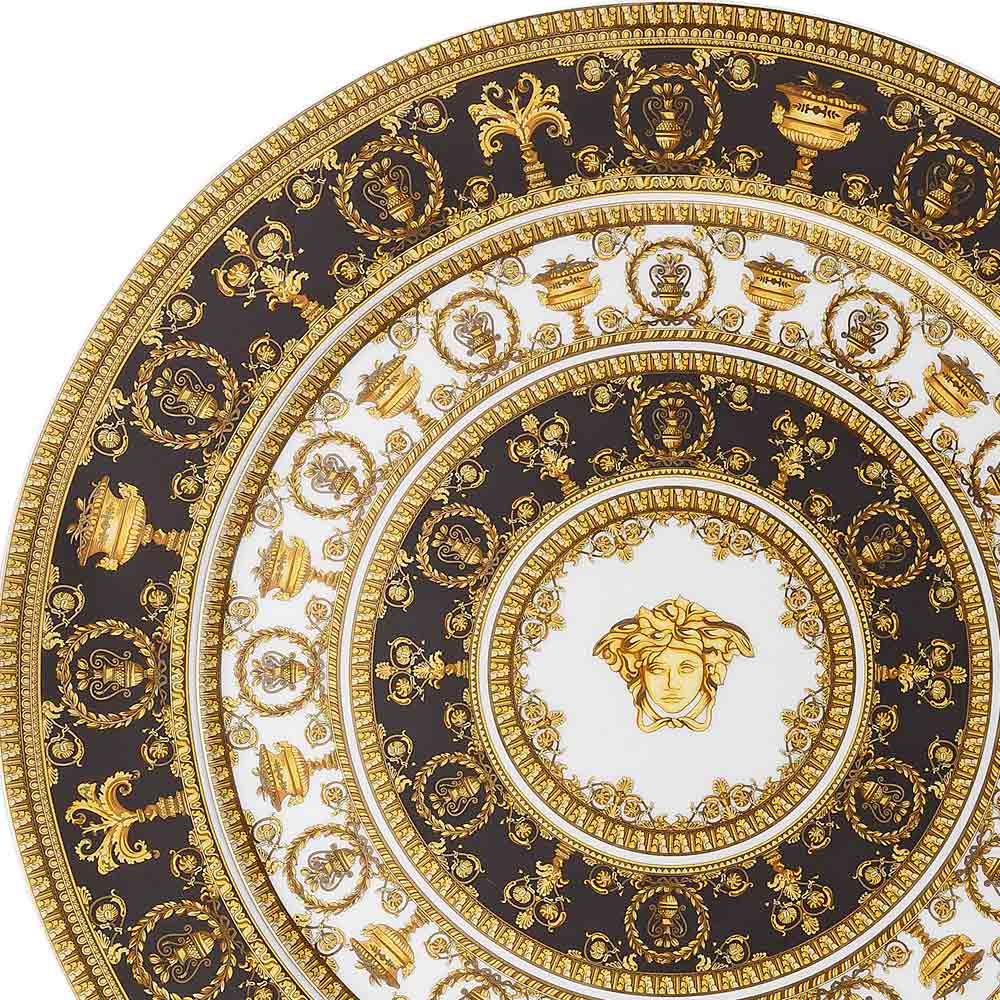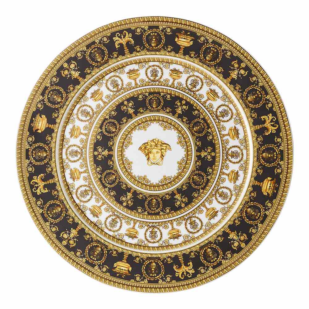 Prostírání I Love Baroque od Versaceho , vyrobené z vzácného porcelánu , je skutečným mistrovským dílem nadčasové elegance a rafinovanosti . Jeho složitý design se vyznačuje bohatými zlatými barokními detaily, které se harmonicky prolínají na černém a bílém pozadí a vytvářejí vizuální efekt exkluzivního luxusu. Uprostřed vyniká ikonická tvář Medúzy , nezaměnitelný symbol maisonu, orámovaná ornamentálními motivy, které umocňují jeho královstvi.