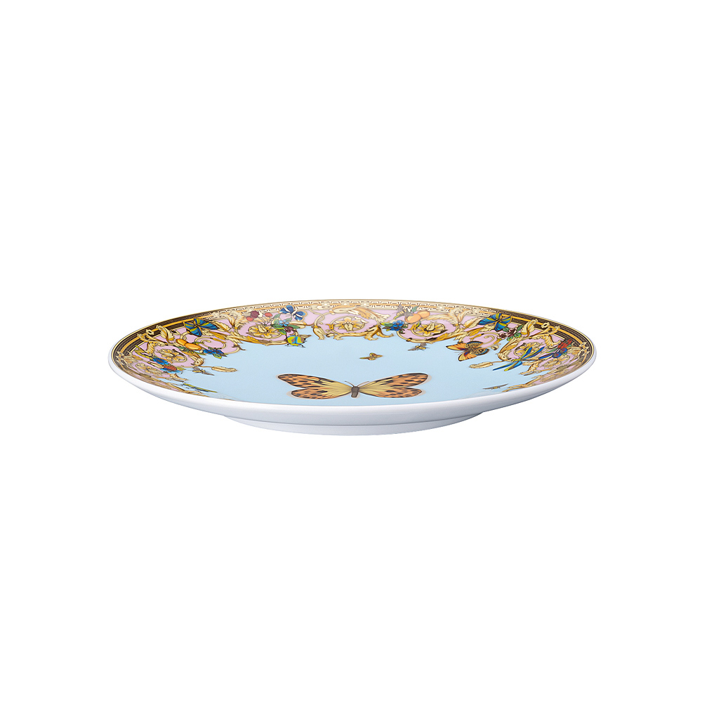 Tento okouzlující porcelánový talíř se vyznačuje jasným a barevným designem, který okamžitě upoutá pozornost, a proto je sběratelským kouskem i rafinovaným nádobím. Uprostřed se vyjímá elegantní motýl, obklopený jemným ornamentálním okrajem s květinovými a arabeskovými motivy, na klidném modrém pozadí.