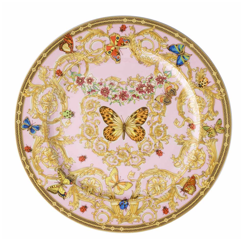 Tento nádherný porcelánový talíř oslavuje krásu přírody svým bohatým designem barevných motýlů a složitými květinovými motivy na nádherném růžovém pozadí. Každý detail je pečlivě zpracován, od zářivých motýlů, kteří jako by létali z talíře, až po jemné květiny a zlaté ozdoby, které rámují a zdobí design.