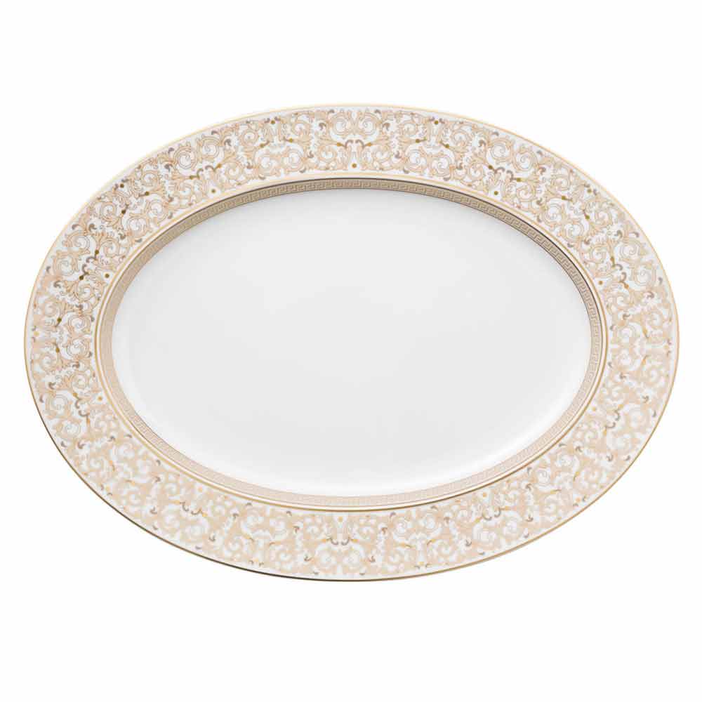 Oválný talíř 40,5x30 cm od Versace je součástí rafinované a luxusní kolekce stolů Medusa Gala.