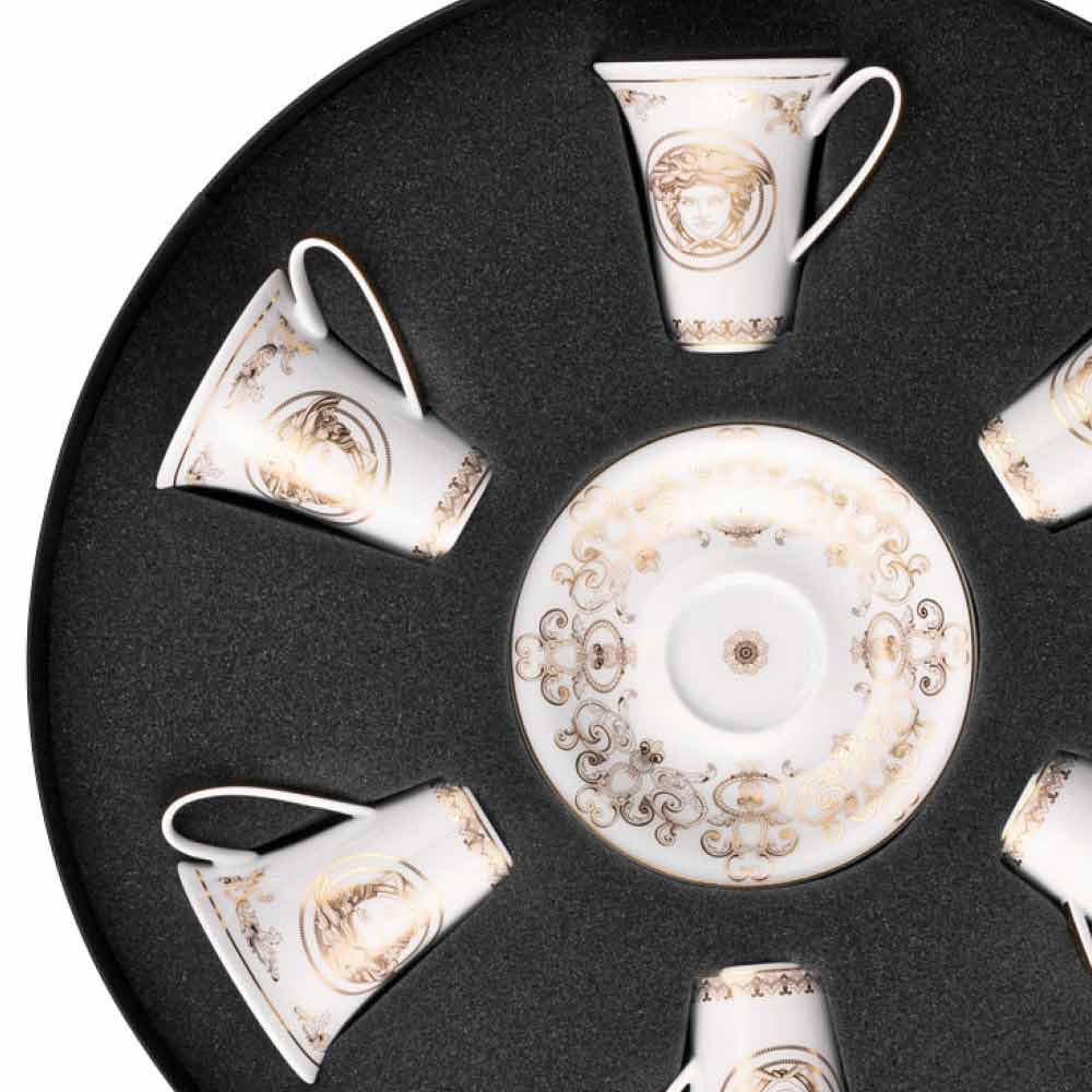 Tato sada 6 šálků obsahuje veškeré vytříbení a luxus nové kolekce stolů Medusa Gala , která v designu a dekoraci nově interpretuje tradiční motivy Versace : ikona znázorňující Medúzu se střídá s rafinovanými barokními ornamenty ve filigránu ze vzácného zlata. Vzrušující kontrastní efekt mezi upřímností porcelánu a ryzího zlata dává život dokonalé mise en place, moderní a zároveň unikátní.