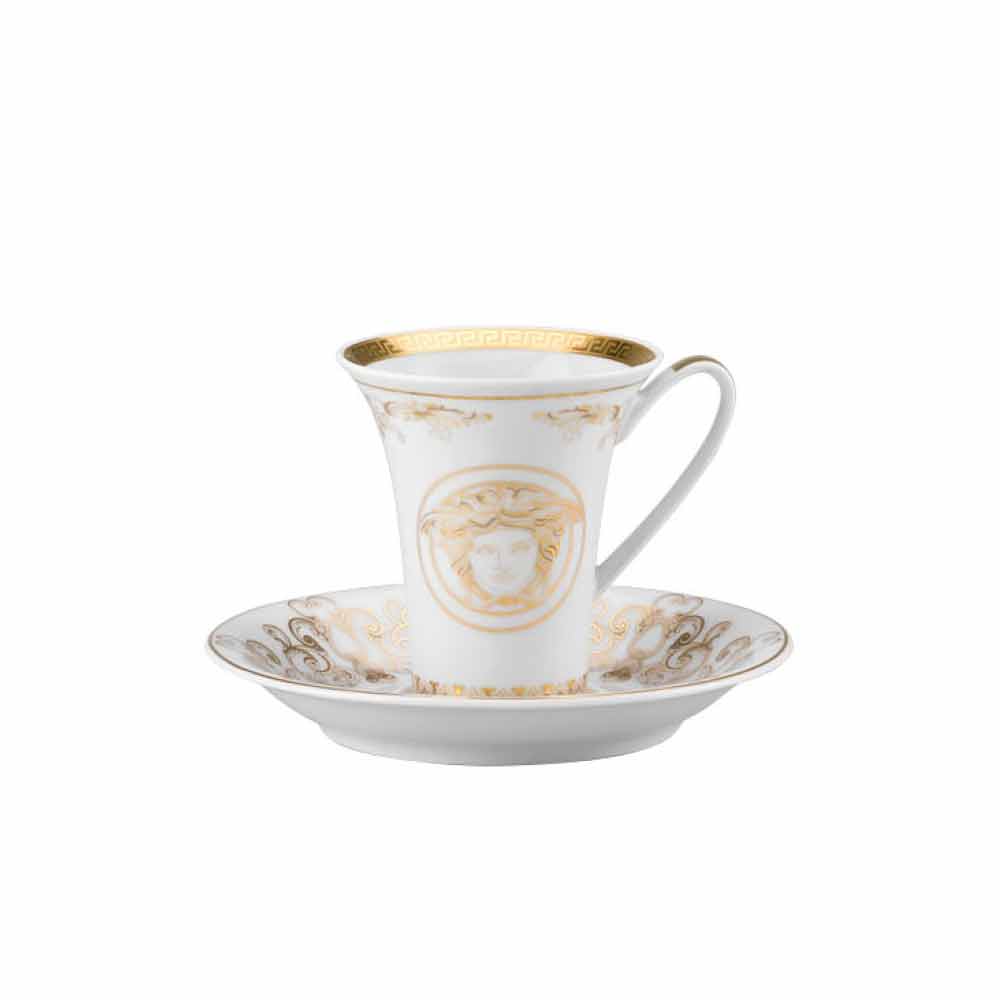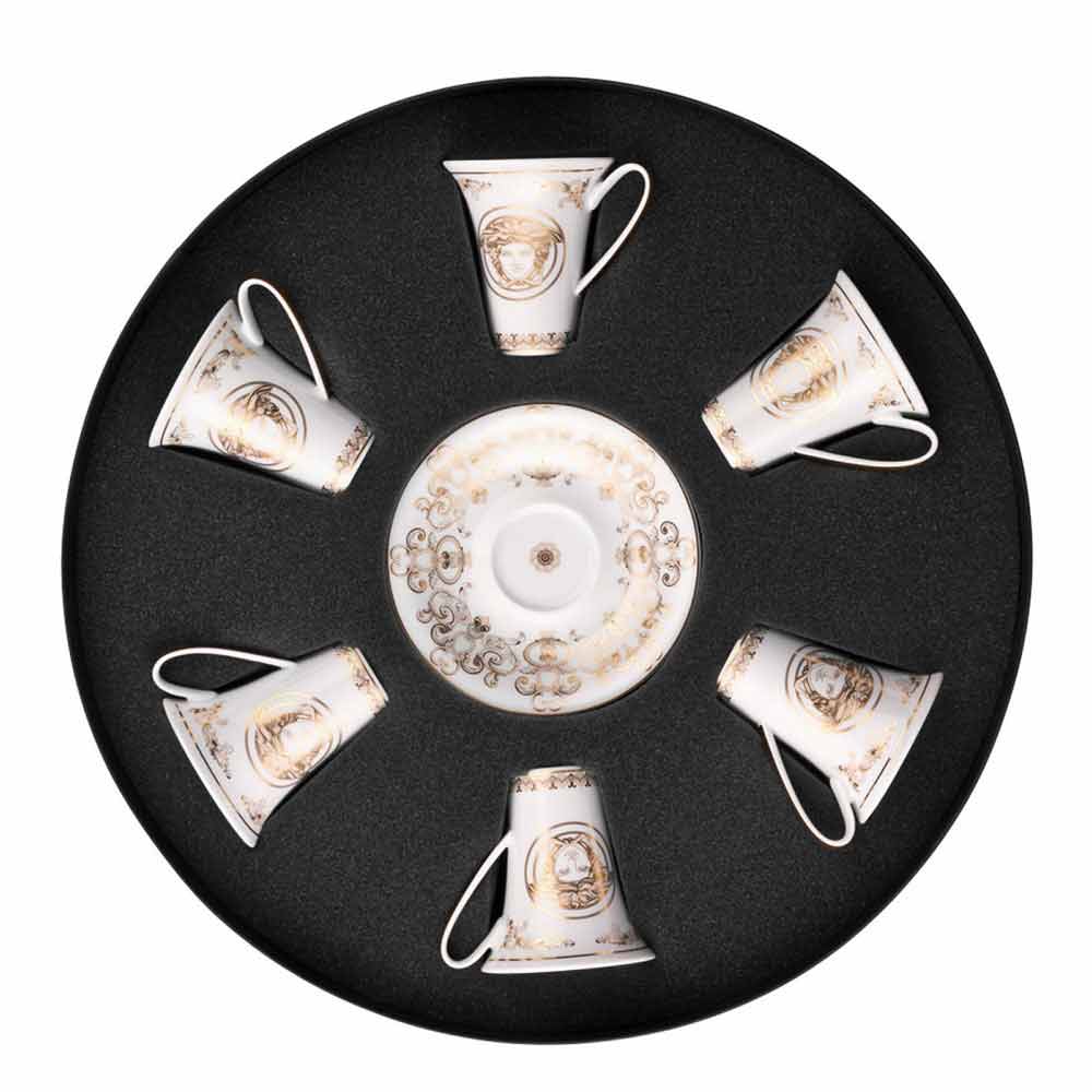 V této sadě 6 šálků veškerá rafinovanost a luxus nové kolekce nádobí Medusa Gala jsou přiloženy, která v designu a dekoraci nově interpretuje tradiční motivy Versace : ikona znázorňující Medúzu se střídá s rafinovanými barokními ornamenty ve vzácném zlatém filigránu. Vzrušující efekt kontrastů mezi upřímností porcelánu a ryzího zlata dává život dokonalé mise en place, moderní a zároveň jedinečné.
