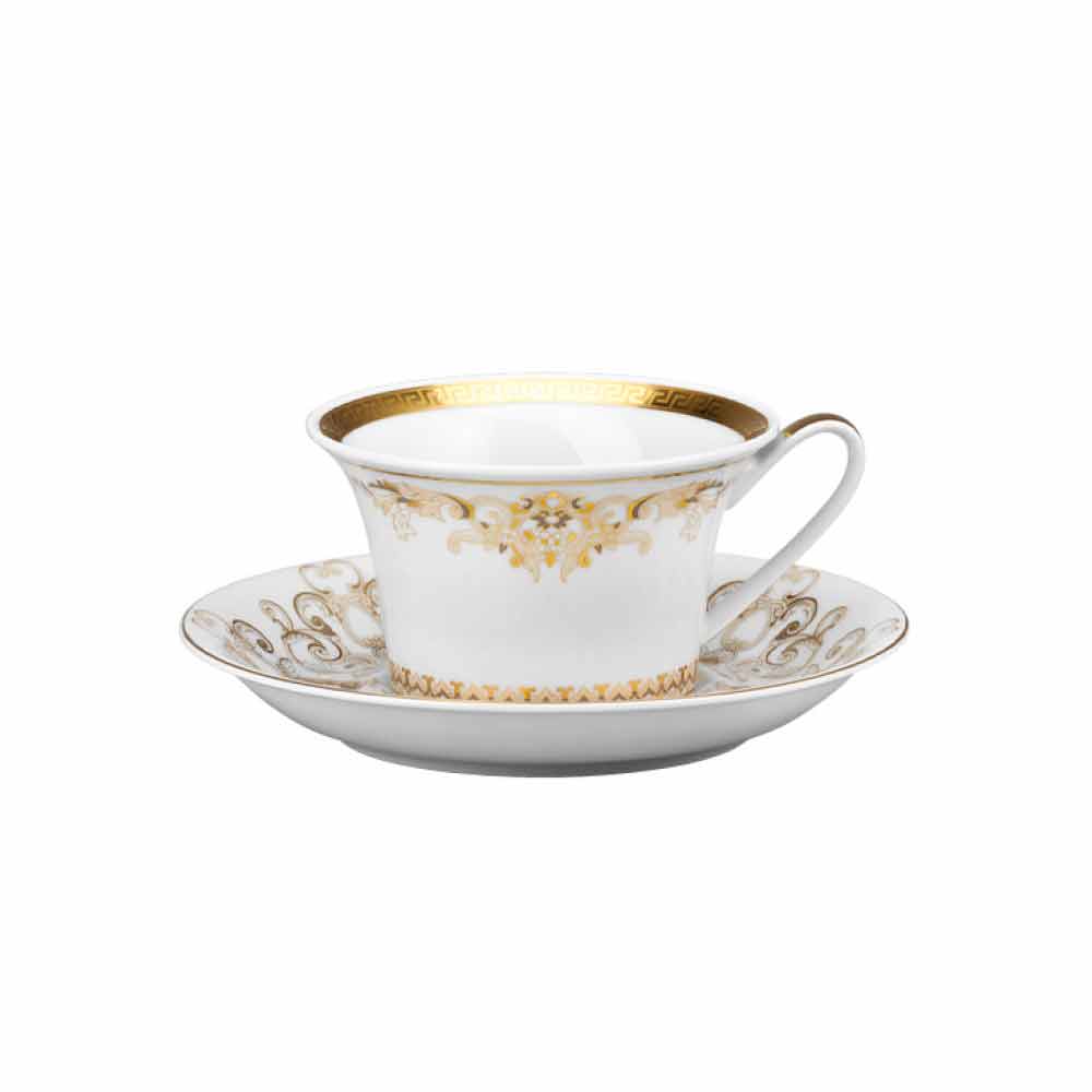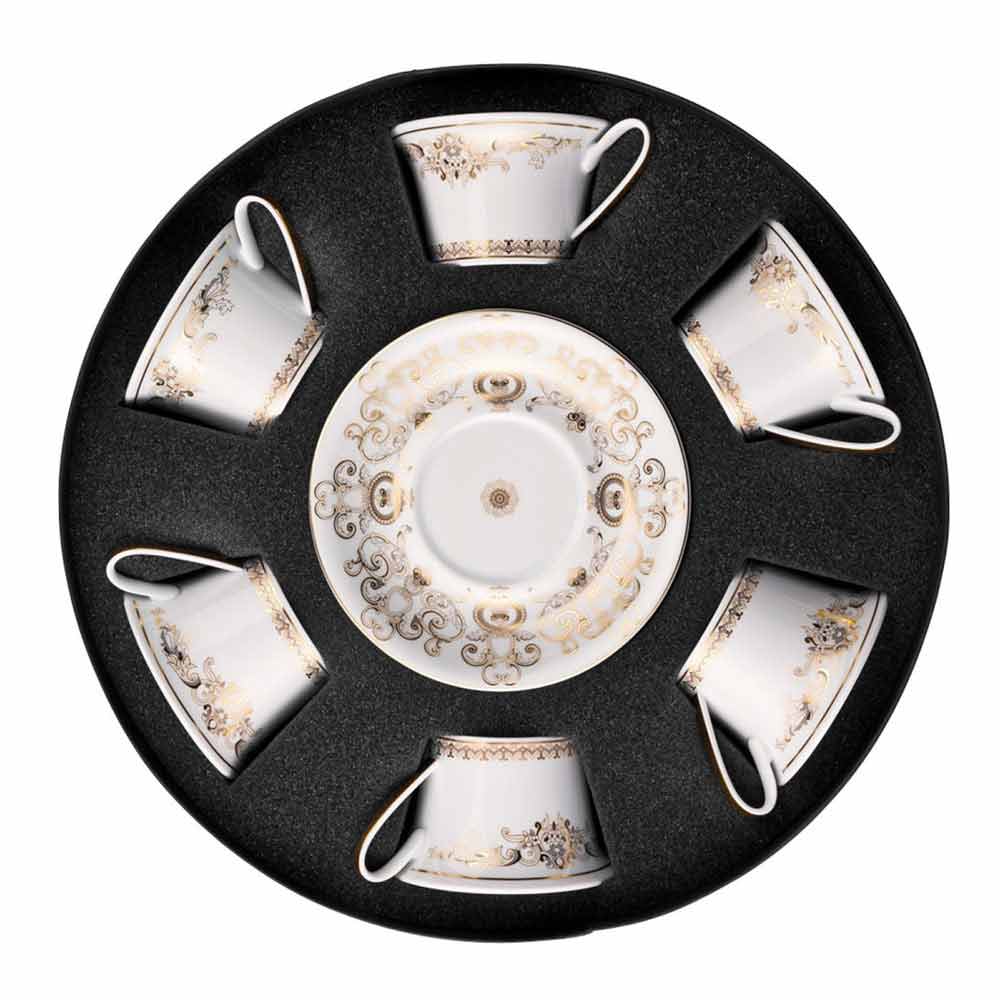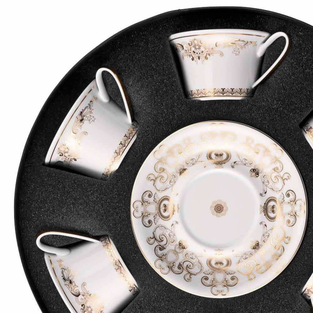 V této sadě 6 čajových šálků veškerá rafinovanost a luxus nové kolekce nádobí Medusa Gala je přiložena, která svým designem a dekorací nově interpretuje tradiční motivy Versace : ikona znázorňující Medúzu se střídá s rafinovanými barokními ornamenty ve vzácném zlatém filigránu. Vzrušující efekt kontrastů mezi bělostí porcelánu a ryzího zlata vytváří dokonalé mise en place, moderní a zároveň jedinečné.