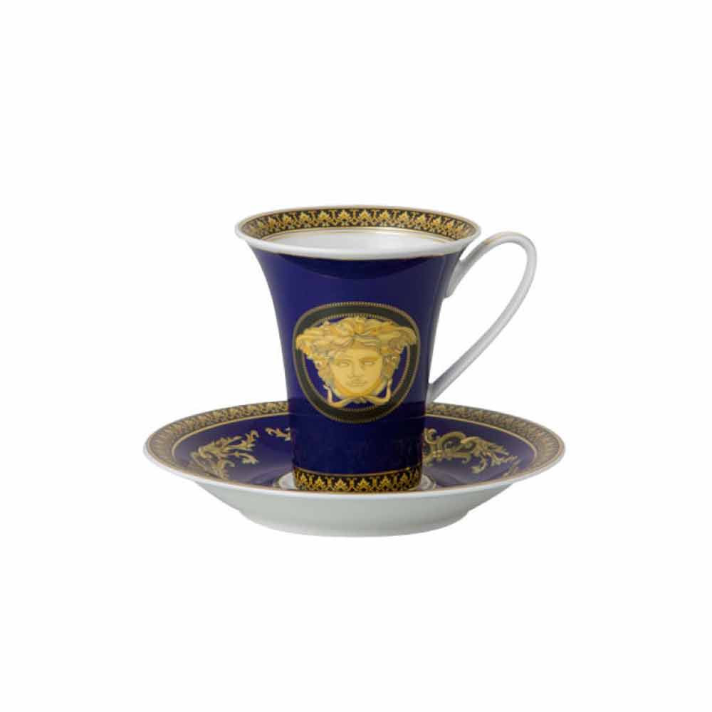 Velmi stylový vysoký šálek s podšálkem od Versace je součástí elegantní moderní kolekce, která v kombinaci s fascinujícím a rafinovaným glamourem připomíná minulé éry a je vyjádřena jasným odstínem modré a nese název Medusa Blue.