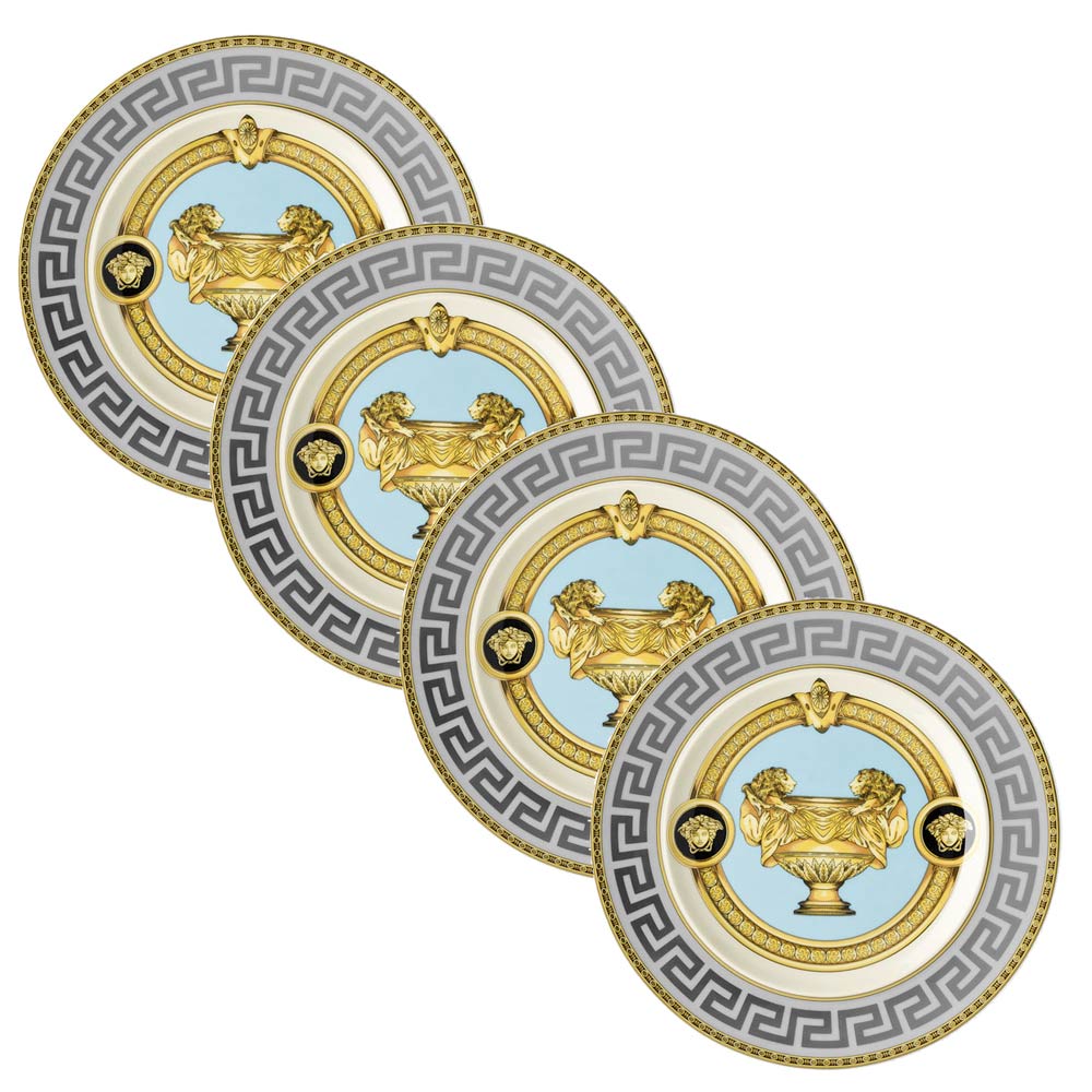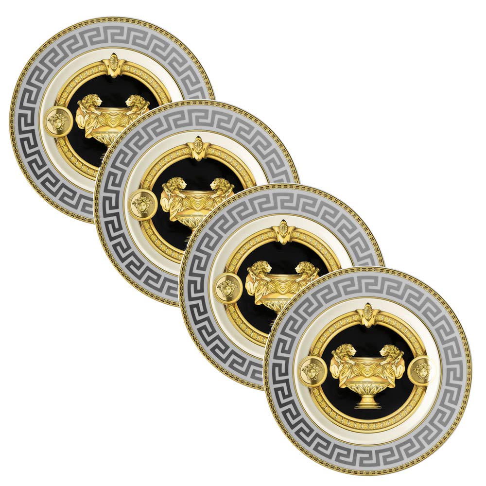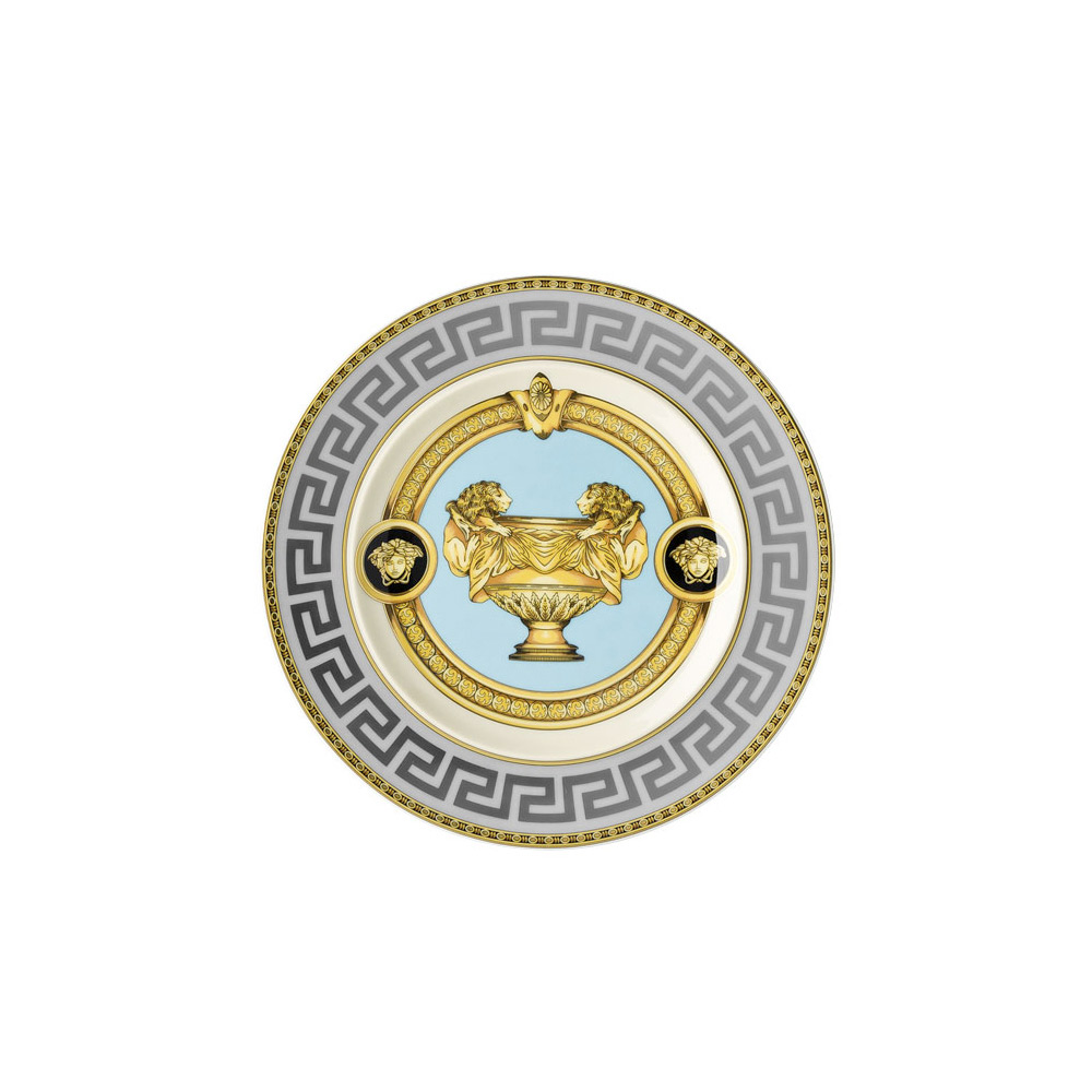 Talíř na chléb Versace Prestige Gala , vyrobený z jemného porcelánu , je dokonalou reprezentací luxusu a nadčasové elegance . Sofistikovaný design se vyznačuje centrální dekorací se zlatou amforou , symbolem královské hodnosti a tradice, orámovanou odvážným řeckým motivem a zlatými detaily, které zachycují podstatu domu. K dispozici v černém nebo světle modrém pozadí a nabízí výběr stylu pro každou příležitost.