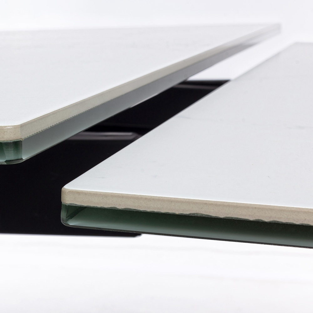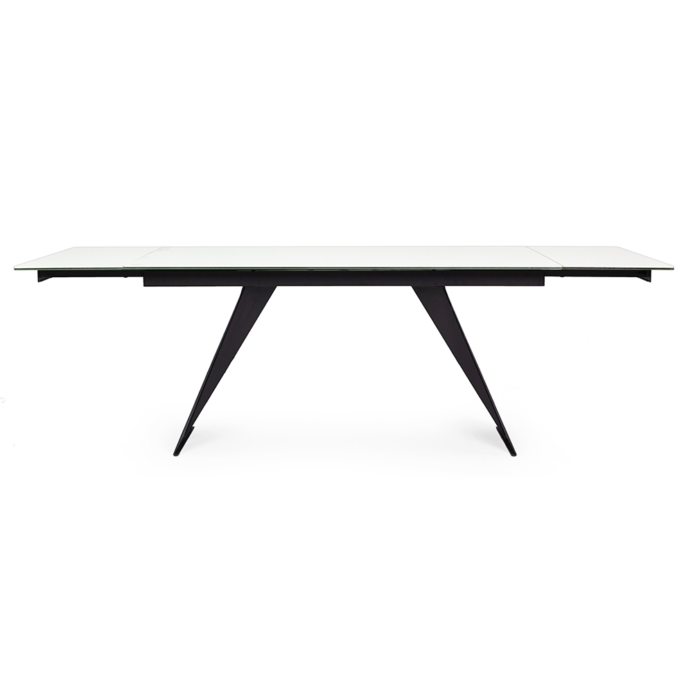 Rozkládací jídelní stůl z oceli a deska z keramiky a skla.