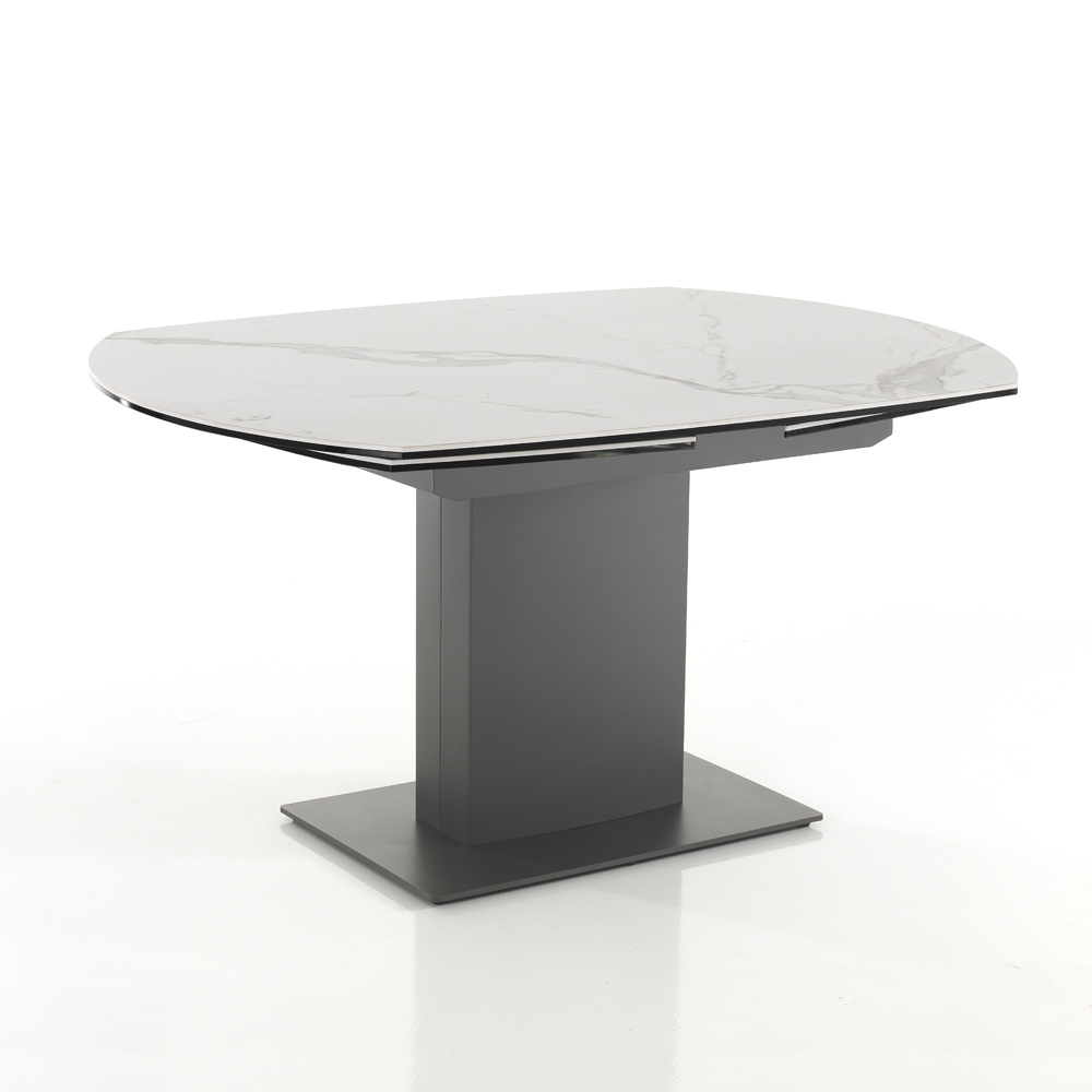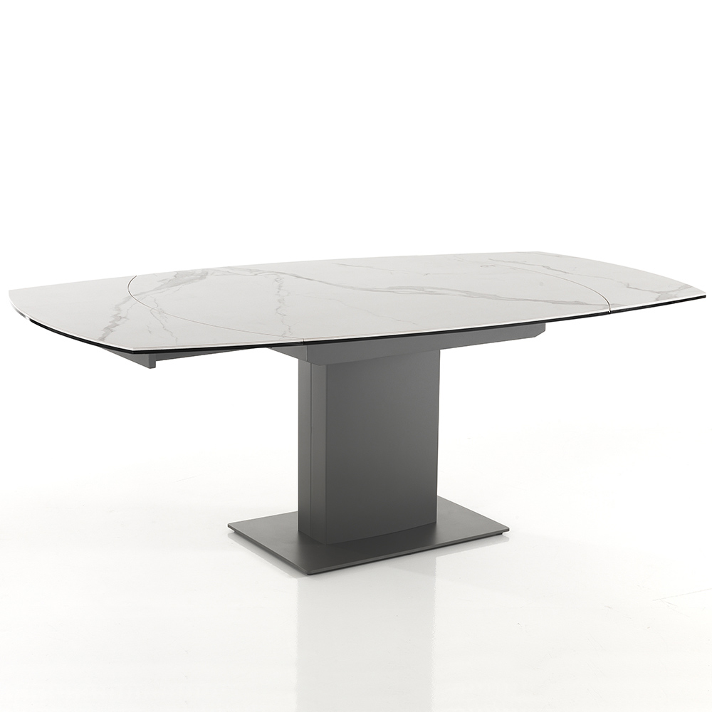 Jídelní stůl s rozkládací deskou z matné keramiky s mramorovým efektem.