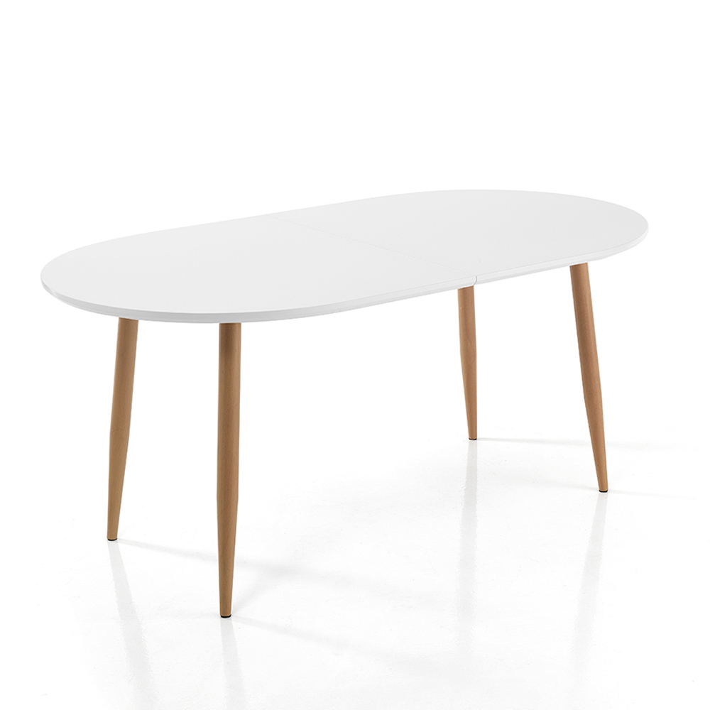 Jídelní stůl s rozkládací oválnou deskou z matné bílé mdf a nohami v dubovém kovu . Top může dosáhnout délky 190 nebo 220 cm díky dvěma vnějším nástavcům po 30 cm. Výrobek s minimálním stylem a vysokou všestranností použití určený pro ty, kteří preferují jednoduché, ale efektní zařízení a pro ty, kteří rádi organizují obědy a večeře ve společnosti, a proto potřebují prostornou plochu pro umístění většího počtu přátel a příbuzných.