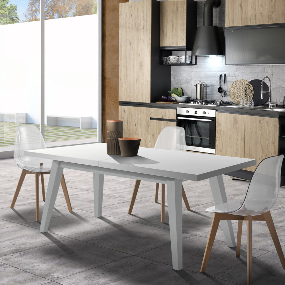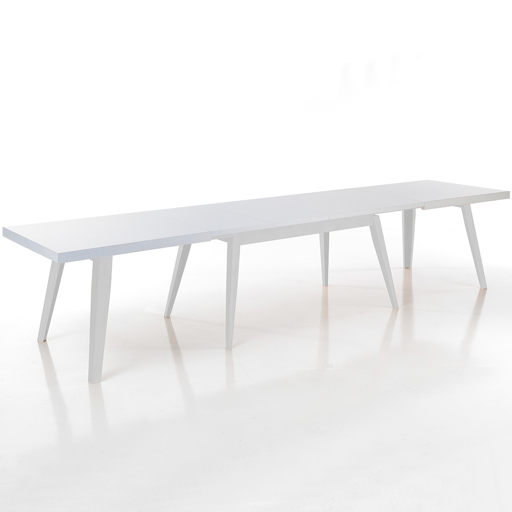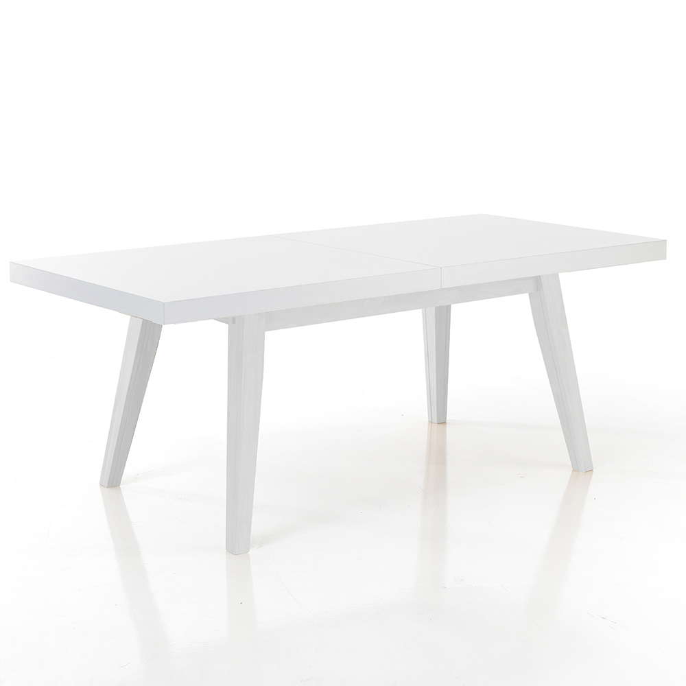 pololesklého bílého lakovaného mdf se 4 nástavci umístěnými pod deskou. Díky možnosti rozšíření pojme větší počet přátel a příbuzných pro strávení příjemných večerů ve společnosti.