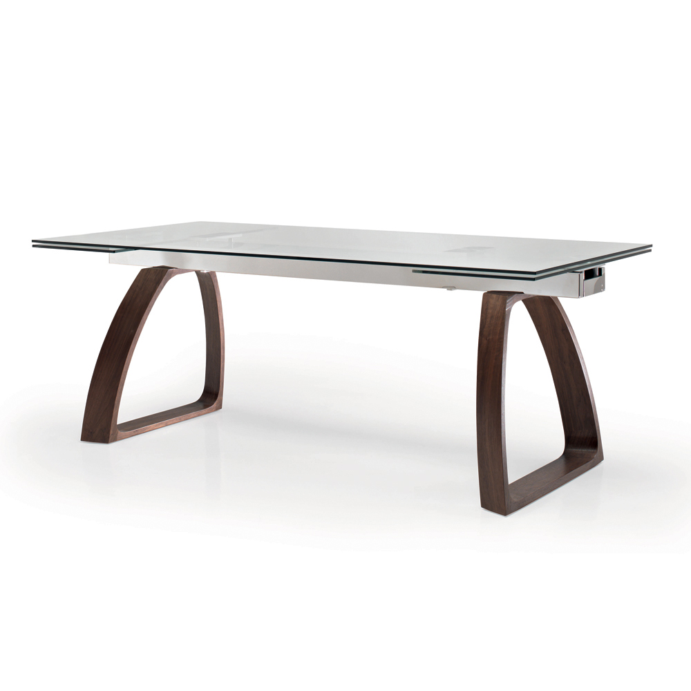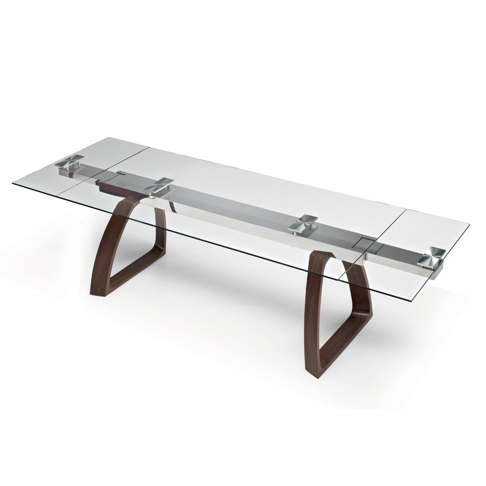 Rozkládací jídelní stůl se skleněnou deskou a dřevěnou podnoží Made in Italy.