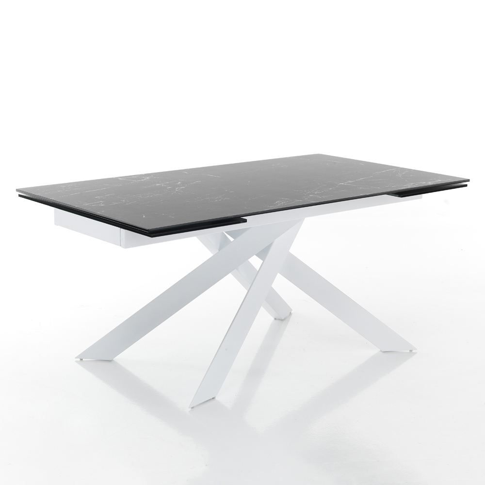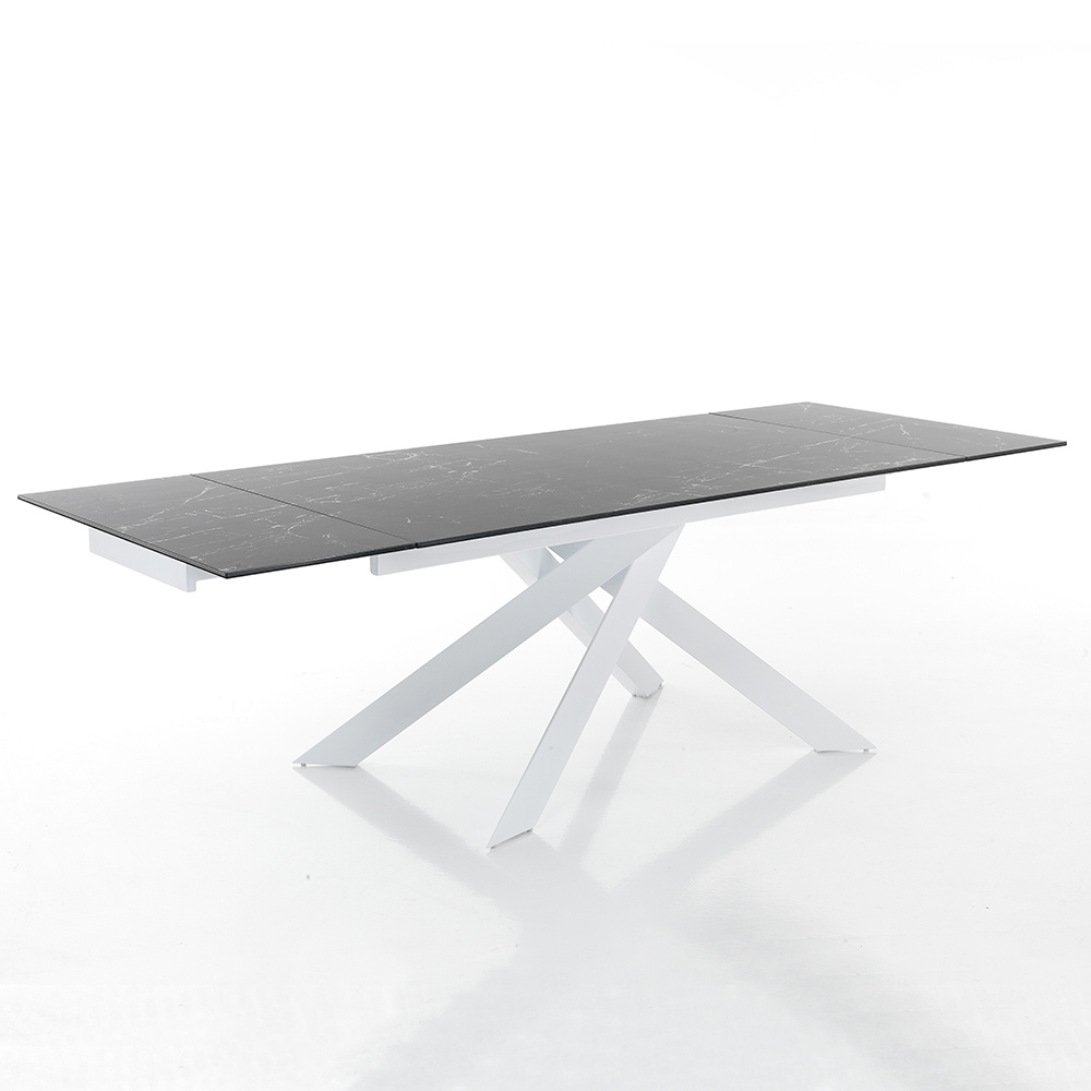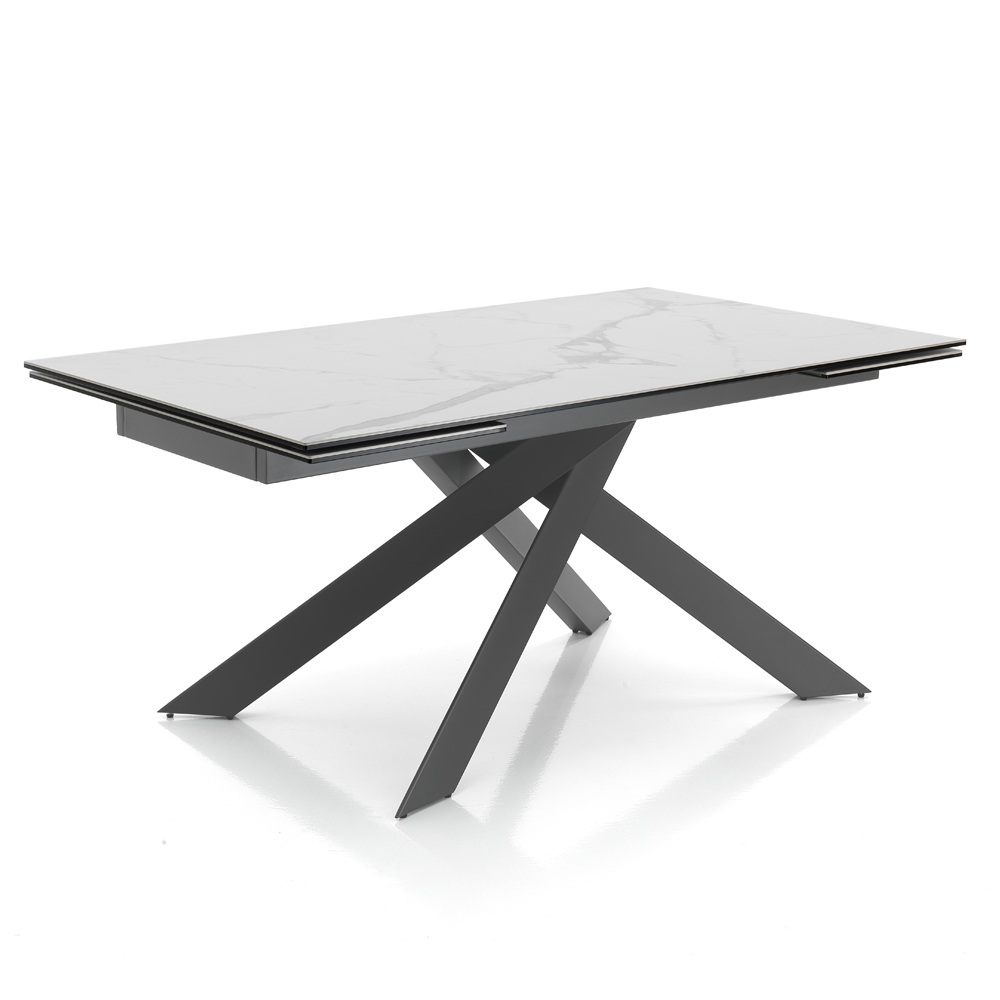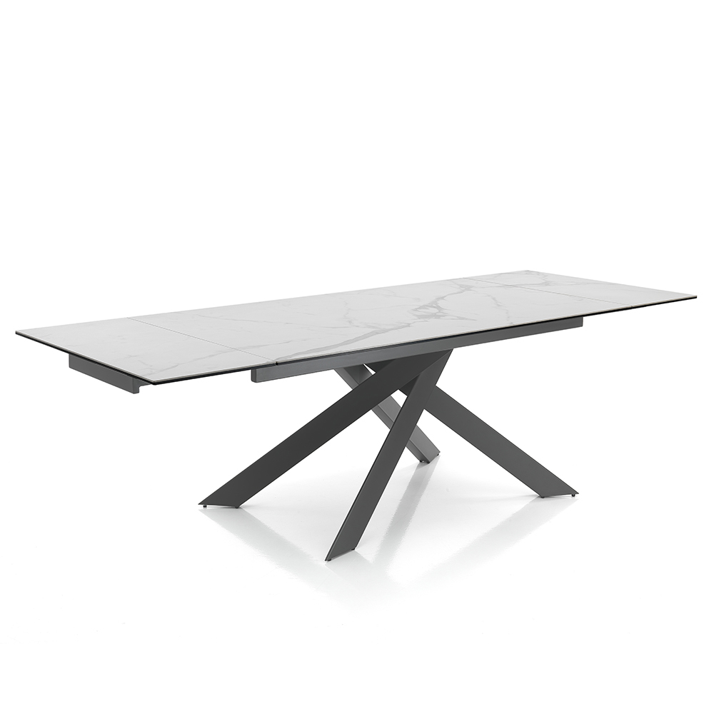 Rozkládací jídelní stůl z keramiky s mramorovým a ocelovým efektem.