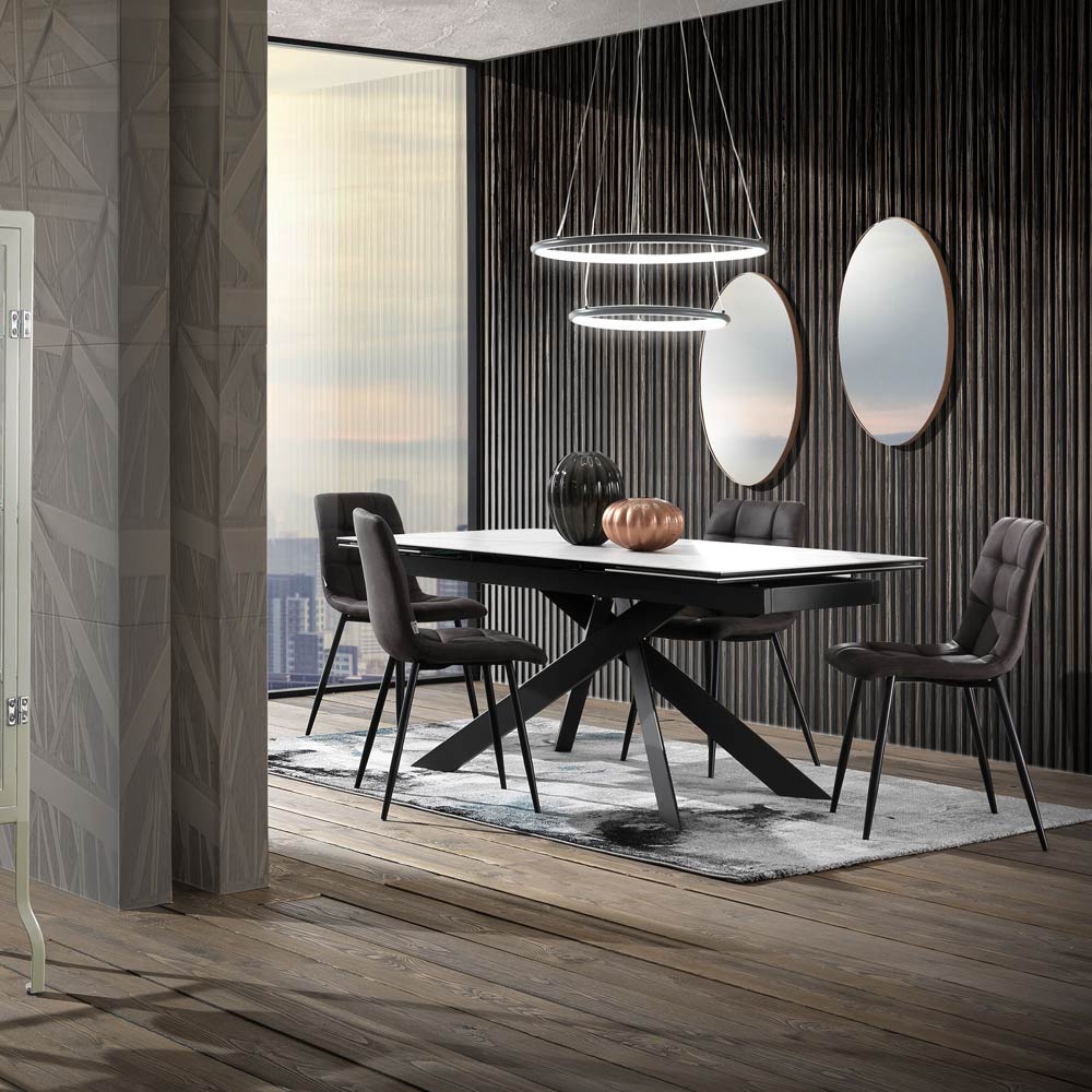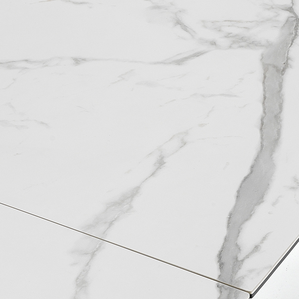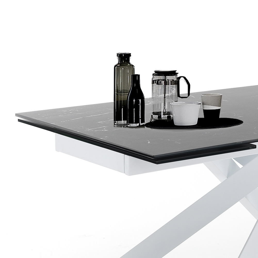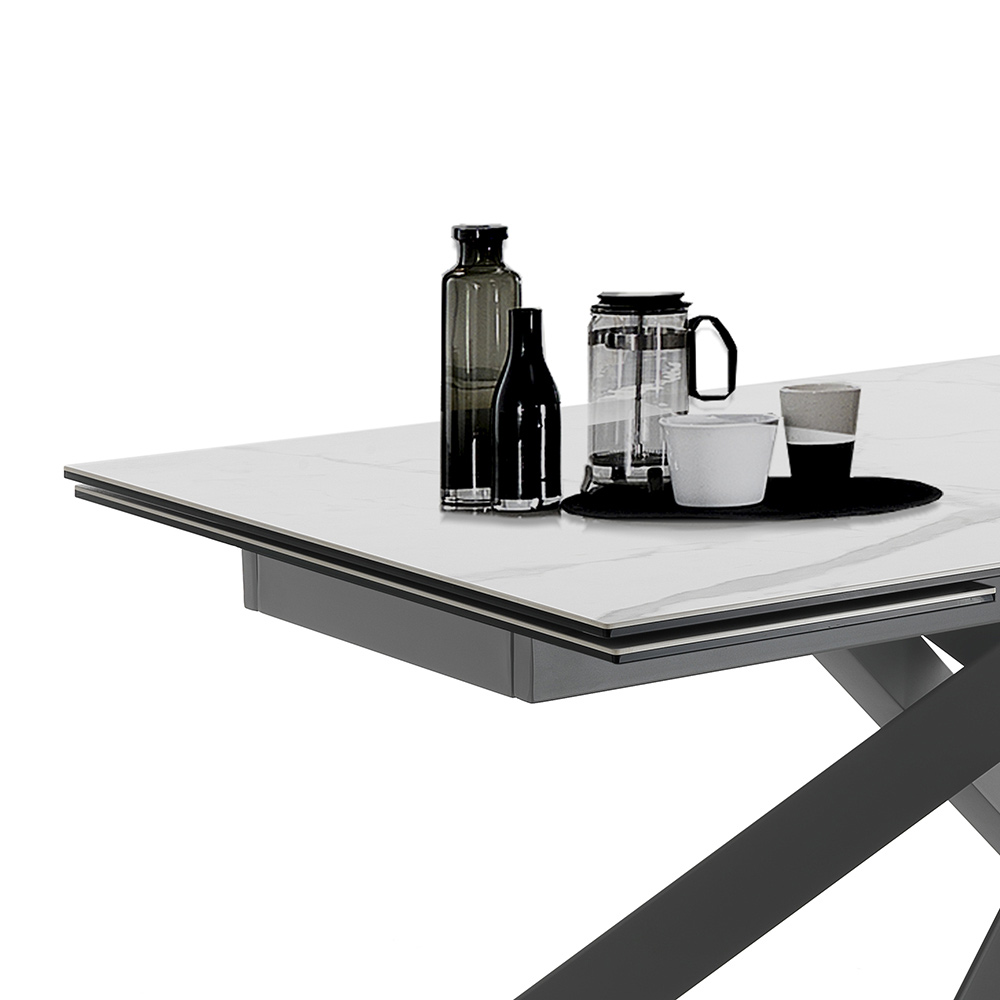 Rozkládací jídelní stůl z keramiky s mramorovým a ocelovým efektem.