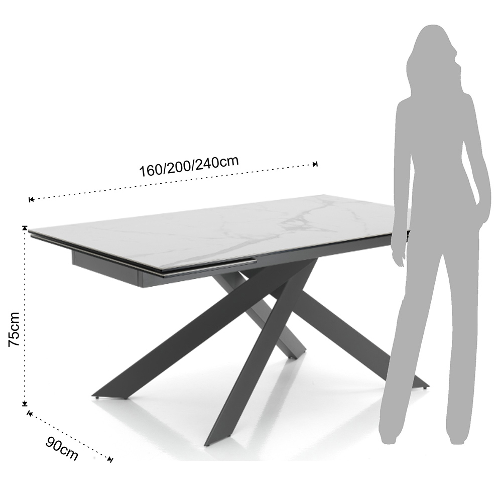 lakovanou ocelovou konstrukcí . Díky dvěma nástavcům po 40 cm umístěným pod deskou může stůl dosáhnout maximální délky 240 cm, což umožňuje pojmout větší počet hostů na skvělé obědy a večeře s přáteli. Dokonalá kombinace elegance keramiky a impozantního detailu ocelové základny vytváří kus nábytku s