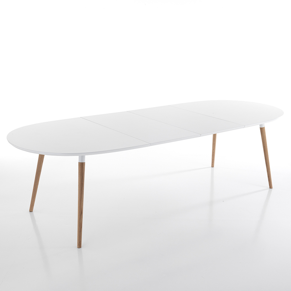 Jídelní stůl s rozkládací deskou z matně bílé lakované mdf a nohami z masivního dřeva s dubovou úpravou . Výrobek s jednoduchým a čistým designem, ideální pro ty, kteří milují zásadní a všestranný styl nábytku, který dokáže vkusně a osobitě dotvořit styl jejich jídelny nebo kuchyně. Jeho silnou stránkou je rozkládací deska díky dvěma nástavcům po 50 cm, které umožňují dosáhnout délky stolu 220 nebo 270 cm.