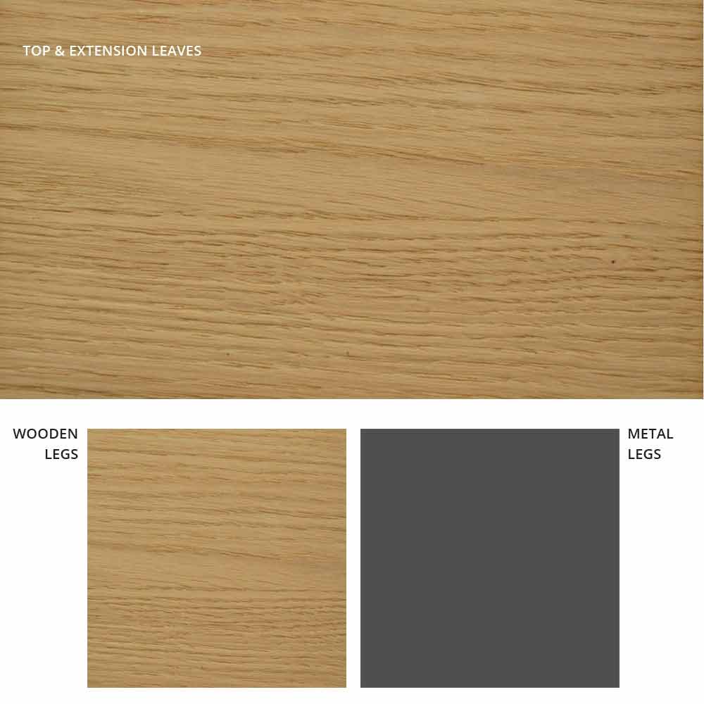 Tento stůl má výrazný design s antracitově lakovaným kovovým rámem a dvěma centrálními nohami z přírodního dubu.