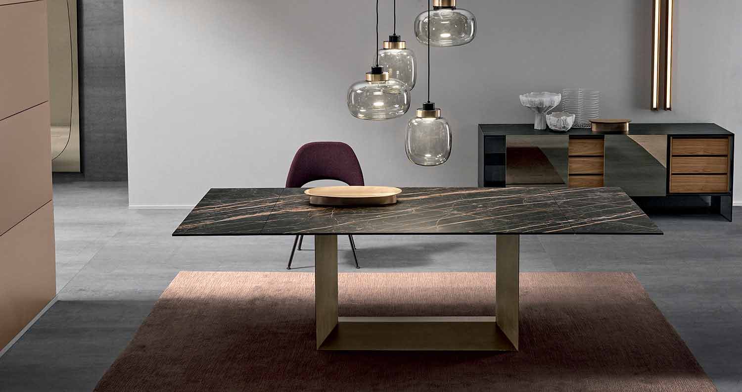 Luxusní rozšiřitelný stůl až na 12 sedadel s keramickou horní deskou Noir Desir a bronzovou kovovou základnou, vyrobené v Itálii.