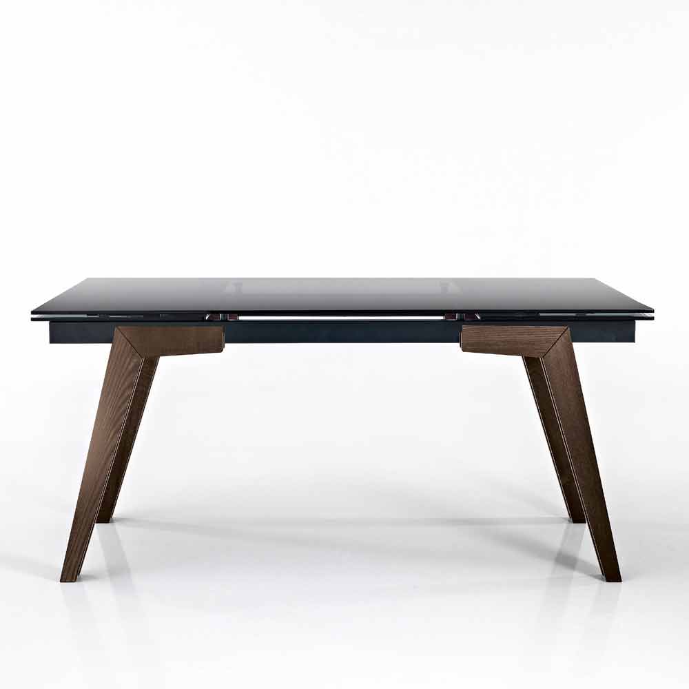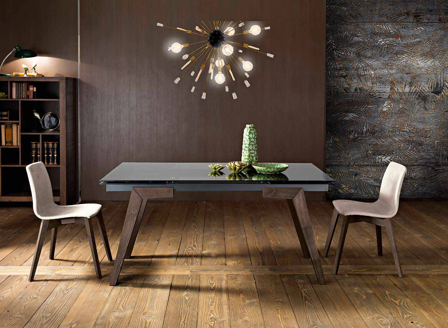 Dimitri je elegantní rozšiřitelný stůl realizovaný v Itálii s povrchem ztvrzeného sklafumè (tloušťka 10 mm) a dubovým povrchem z masivního dřeva dostupného ve dvou různých provedeních: