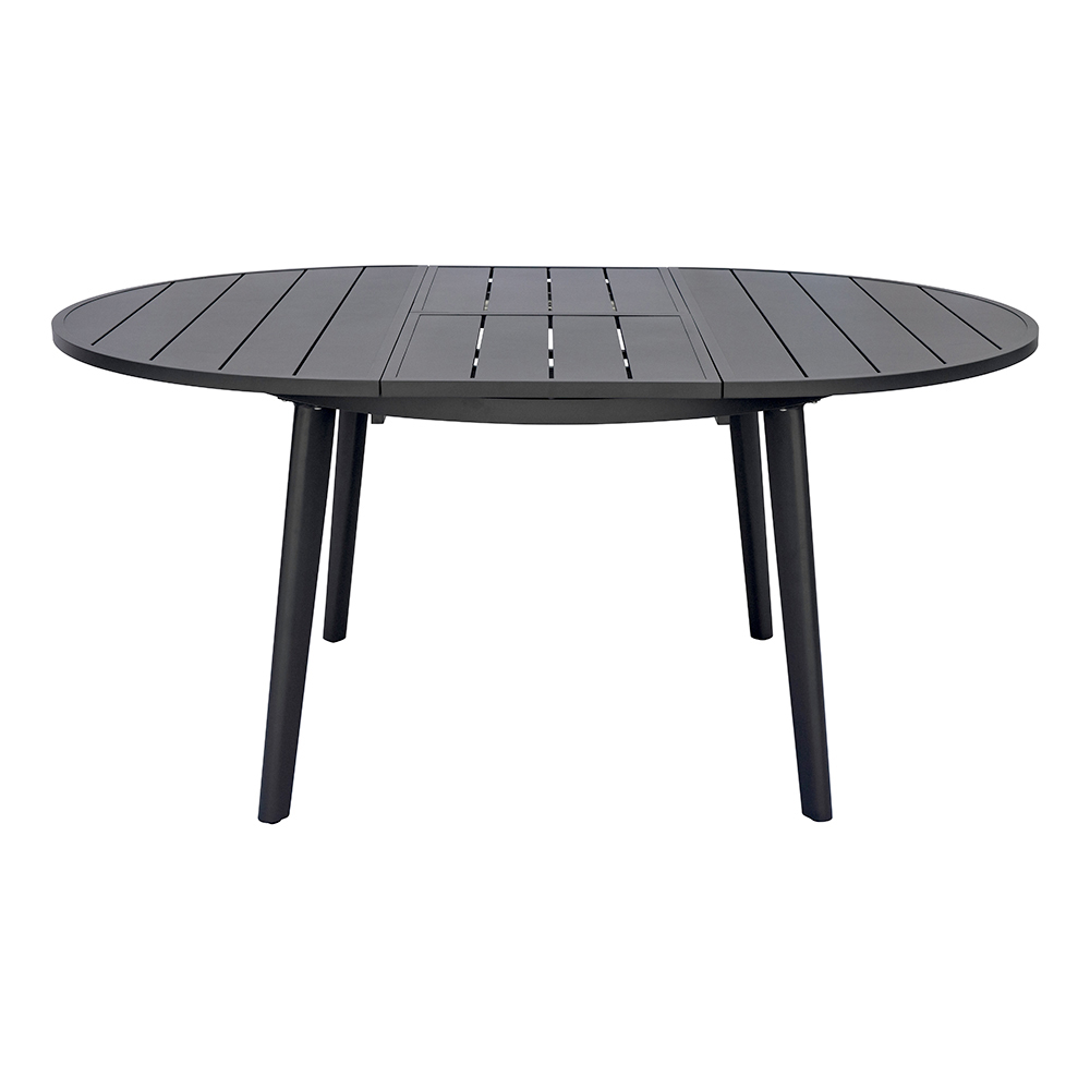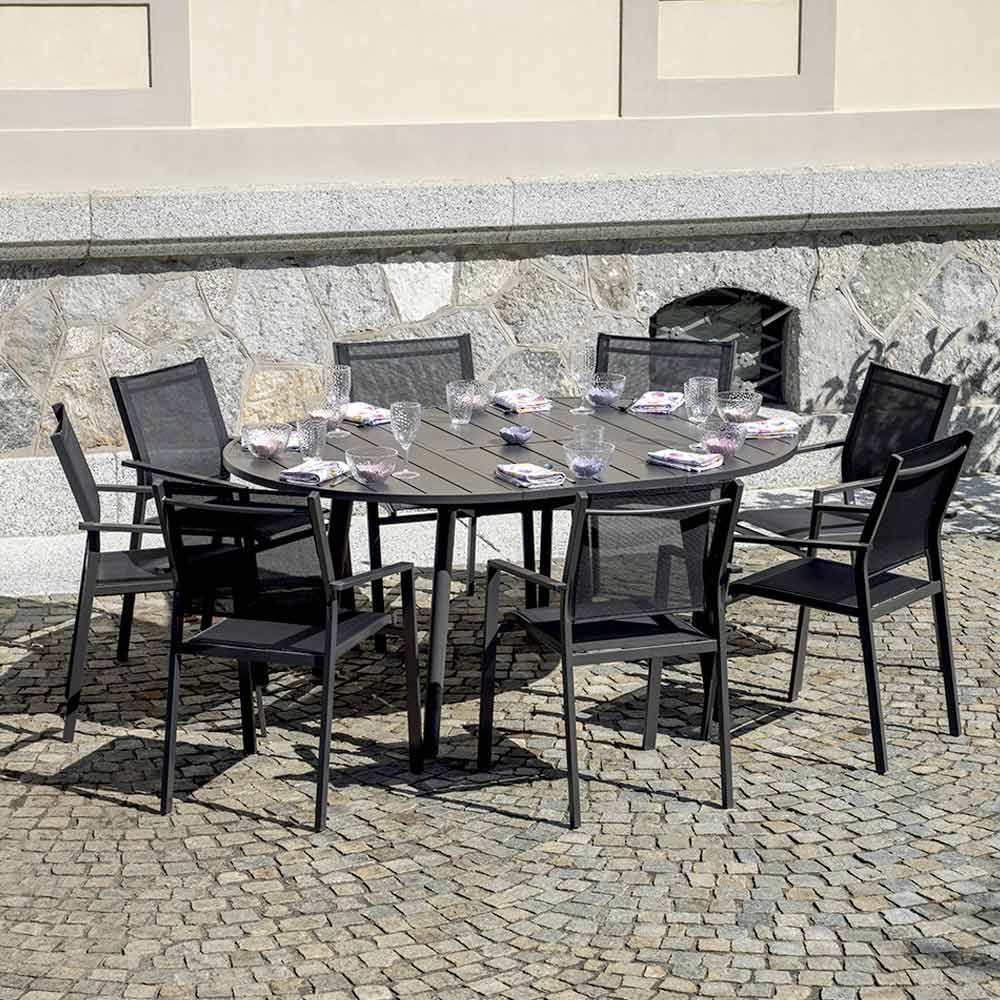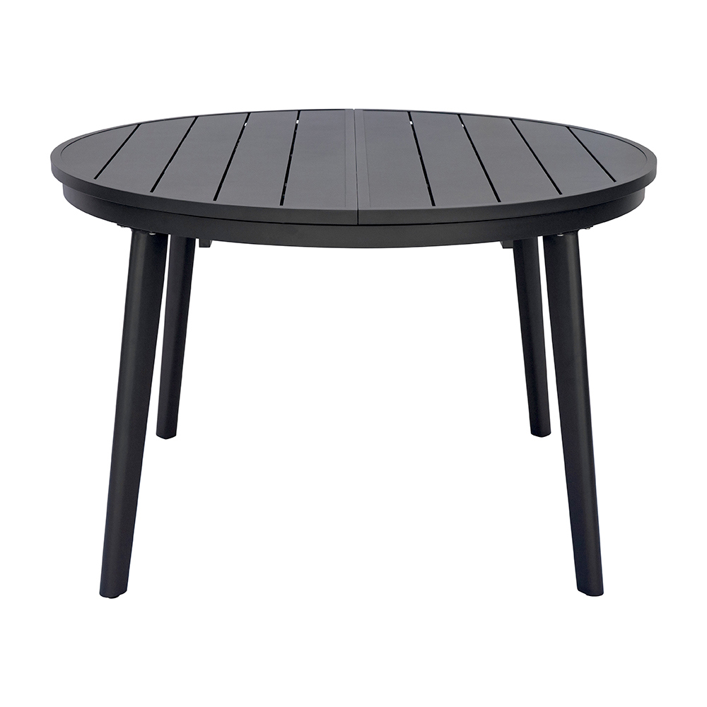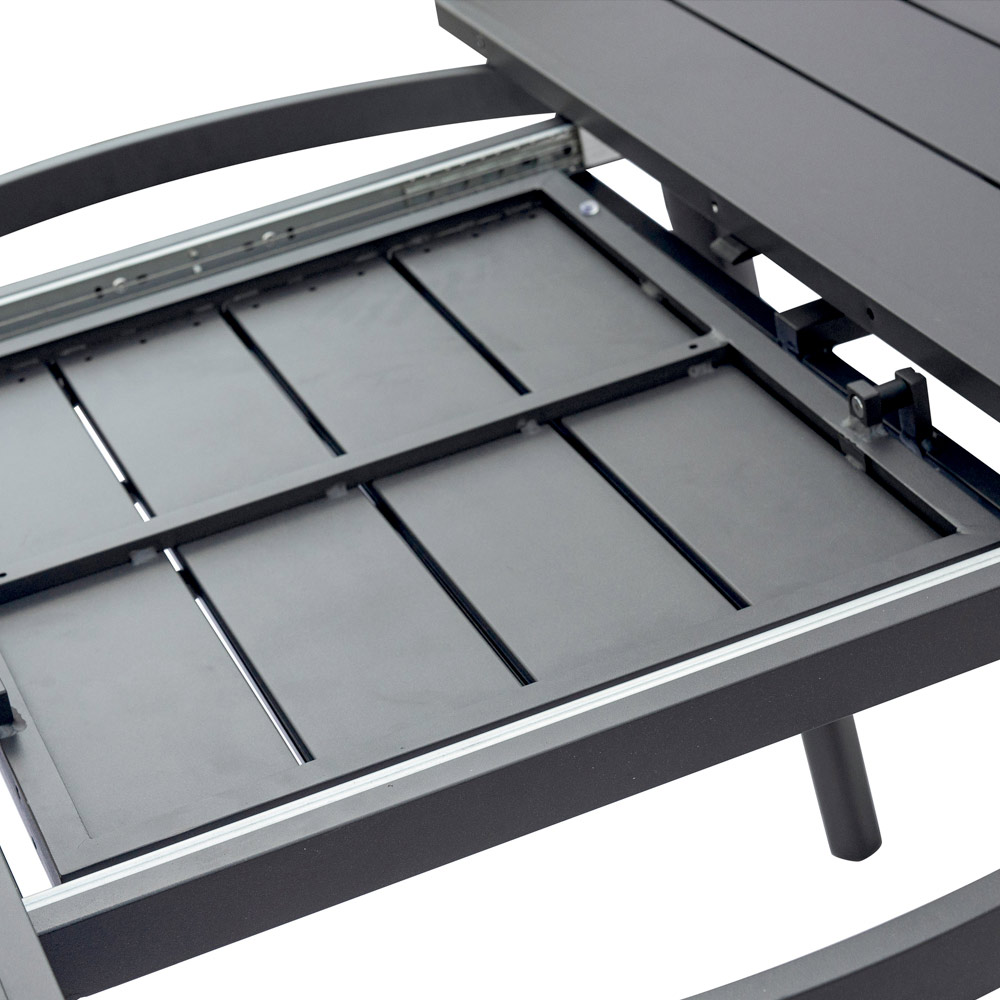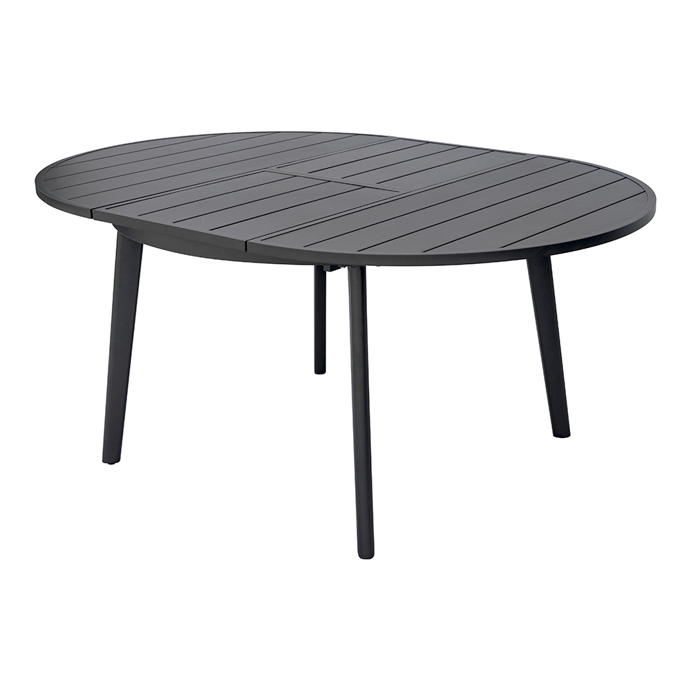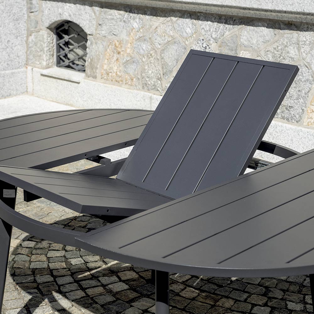 Antracitová hliníková deska stolu zajišťuje robustnost a odolnost, dokonale odolává povětrnostním vlivům, aniž by časem ztrácela lesk. Elegantní, rovné lamely dodávají stolu rafinovaný, moderní vzhled, zatímco pevná konstrukce zajišťuje stabilitu a zároveň lehkost.