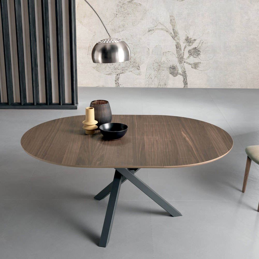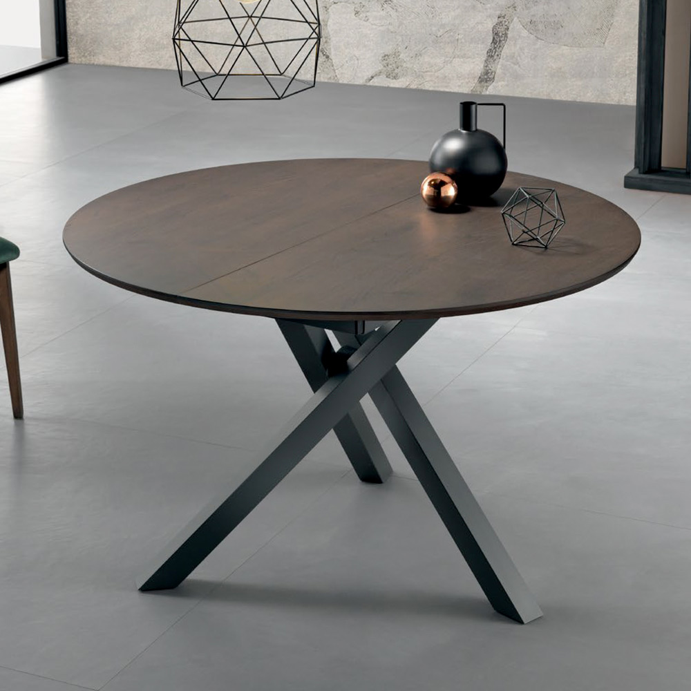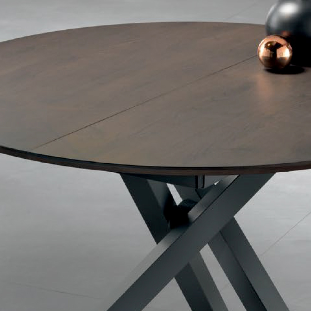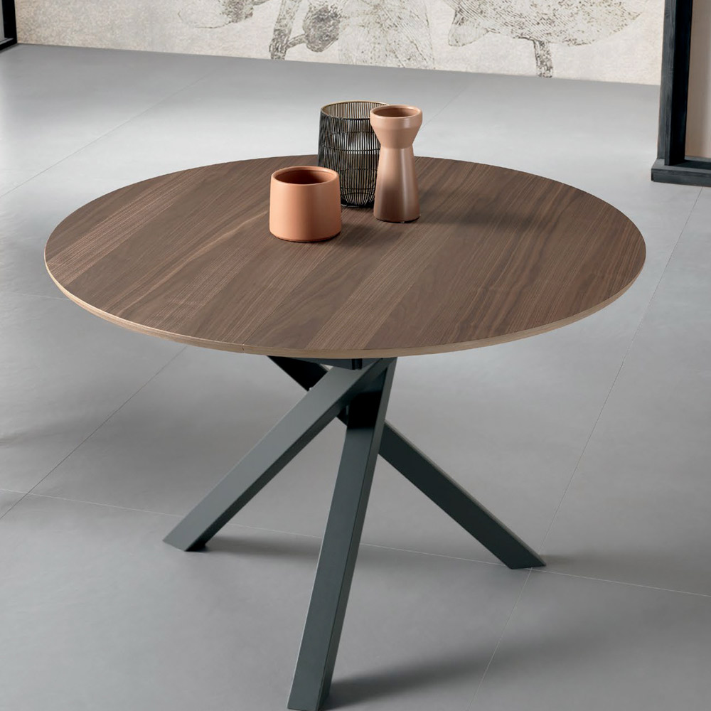 Kulatý stůl, průměr 120 cm, rozkládací až 170 cm, s deskou z dýhy z ořechového dřeva Canaletto o tloušťce 20 mm a zkoseným profilem.
