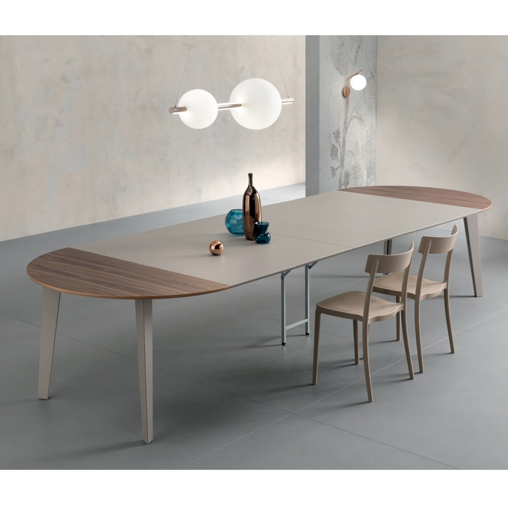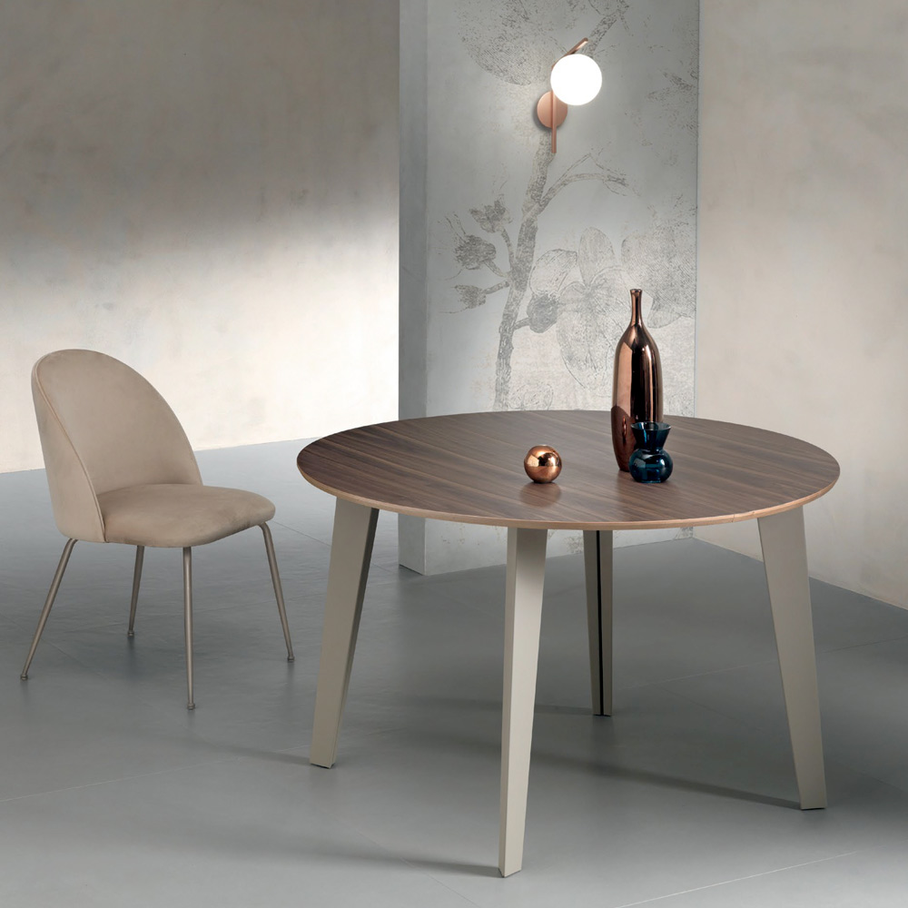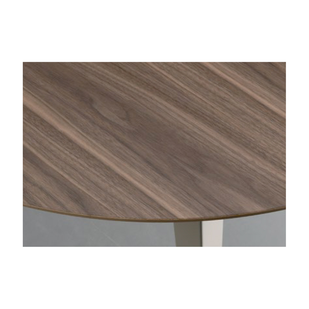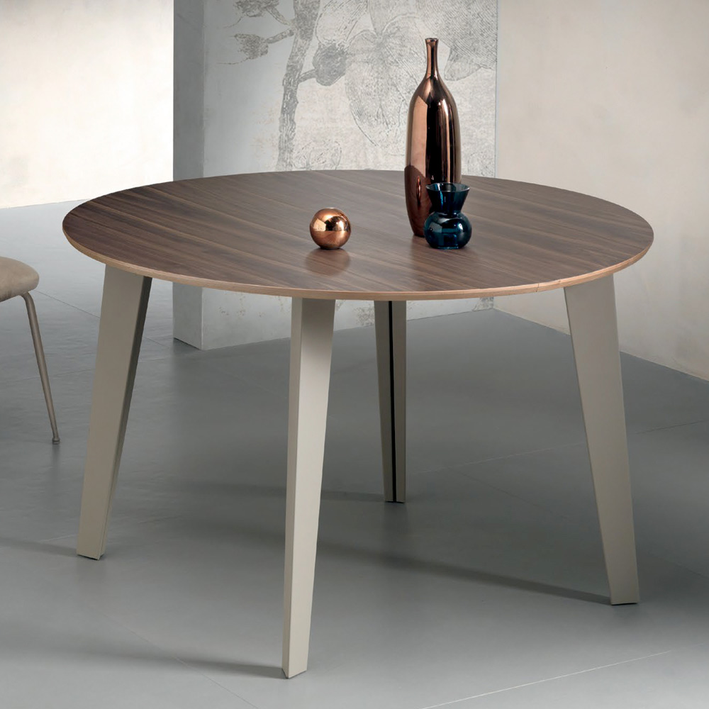 Kulatý stůl, průměr 120 cm, rozkládací na 276 nebo 380 cm, s deskou z ořechové dýhy Canaletto o tloušťce 20 mm a šikmým profilem.
