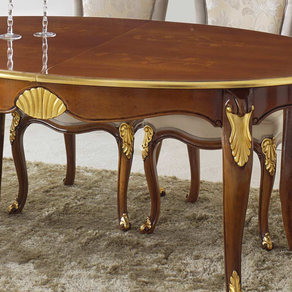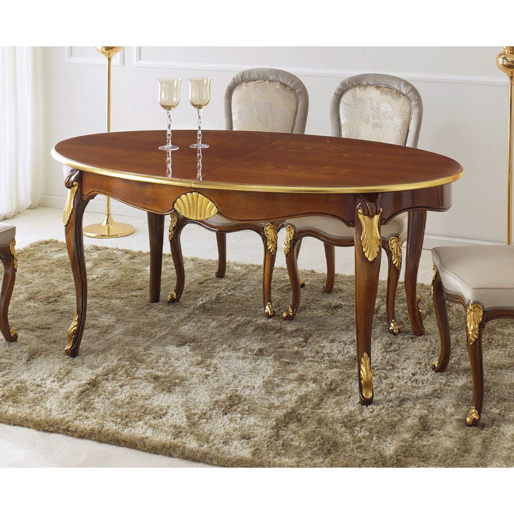 Oválný jídelní stůl s rozkládací deskou díky dvěma 50 cm vnitřním nástavcům, vyrobený výhradně ze dřeva a dostupný v provedení ořech Bassano a starožitné zlato nebo bílé a zlaté dřevo. Jedinečný a vytříbený doplněk, kompletně