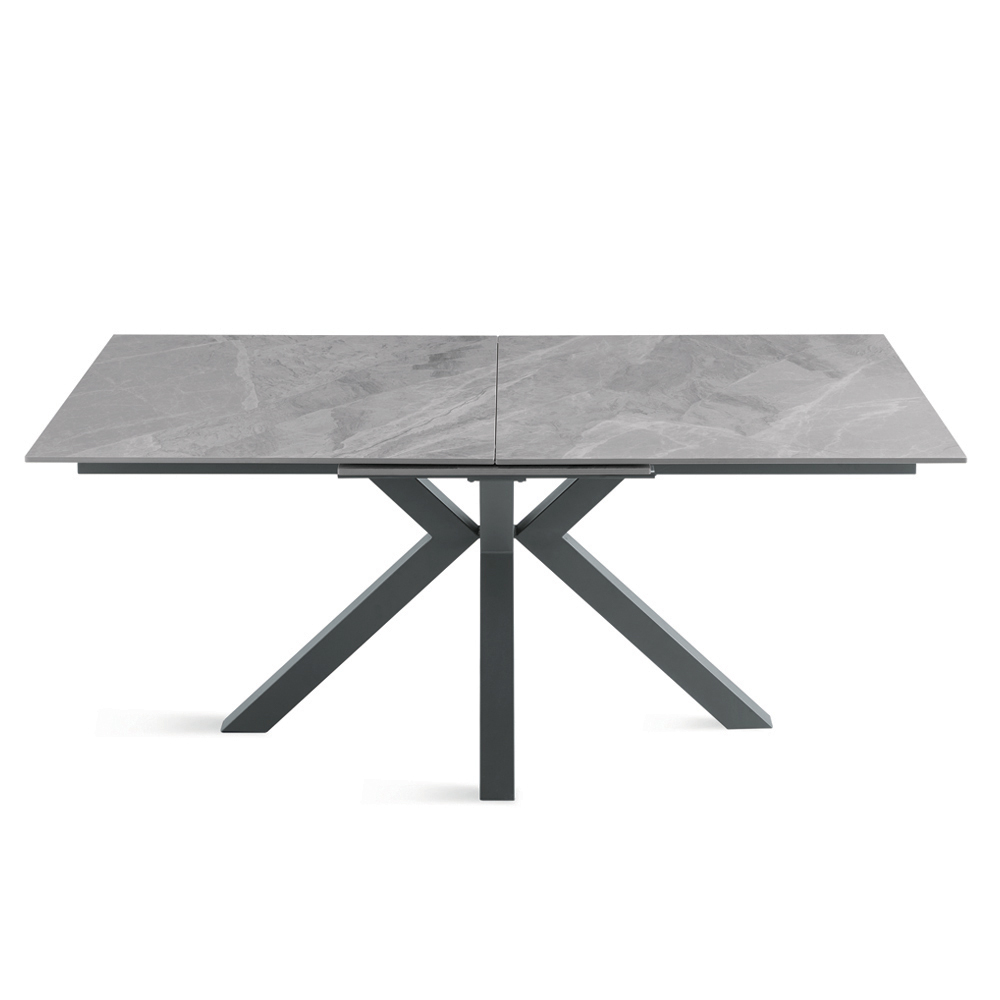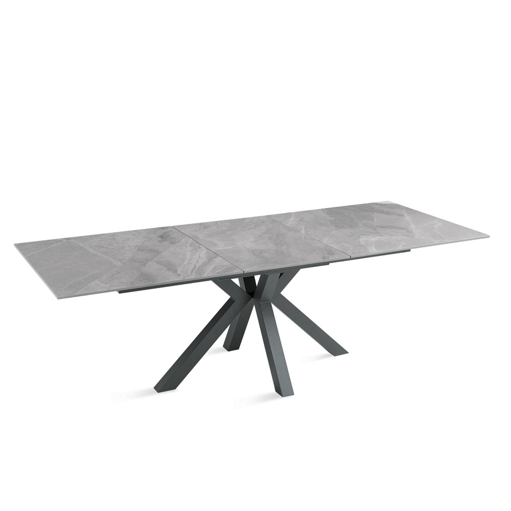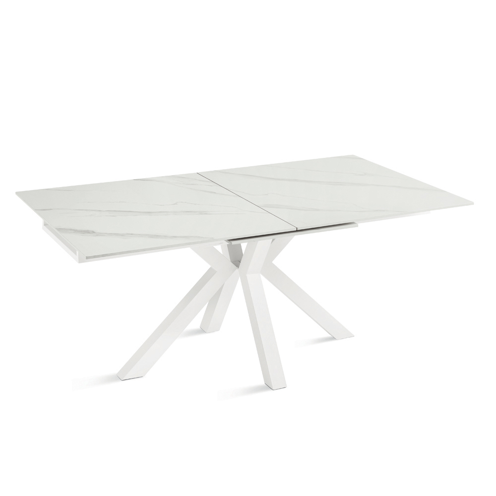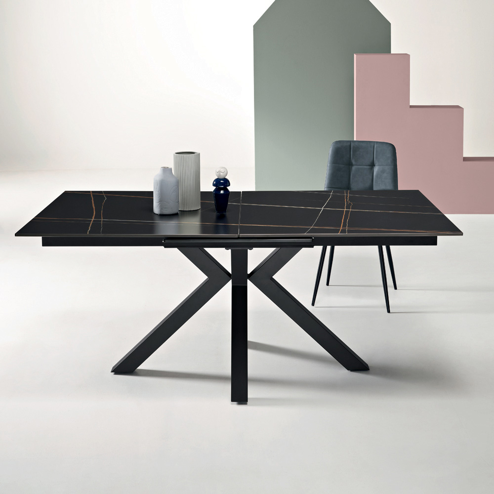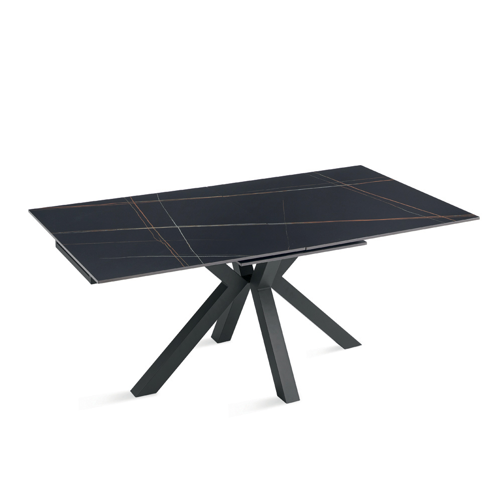 Rozkládací jídelní stůl s moderním vzhledem, ideální pro vylepšení vaší jídelny nebo obývacího pokoje . Deska ze slinutého kamene s mramorovým efektem kombinuje vytříbenou estetiku s praktičností, zatímco lakovaná kovová základna zajišťuje stabilitu a robustnost.