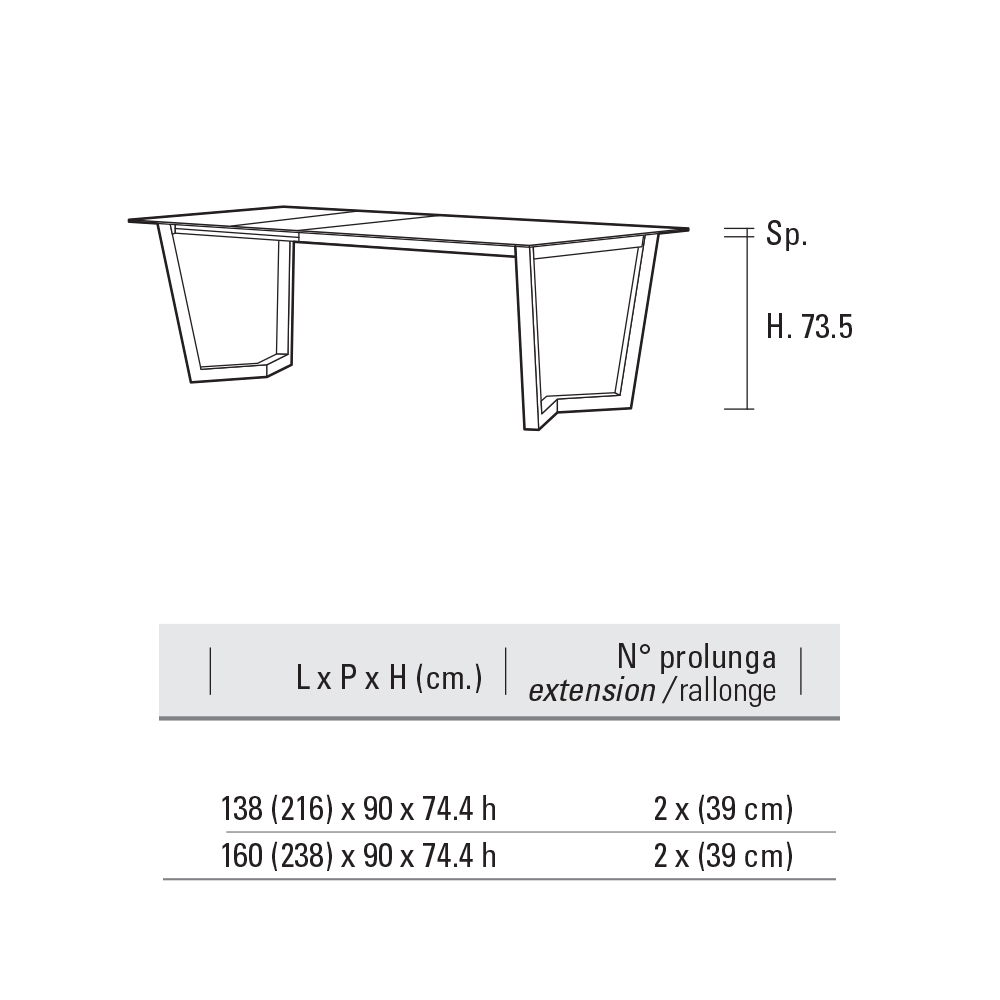 - D 160/238 x H 90 x V 74,4 cm.