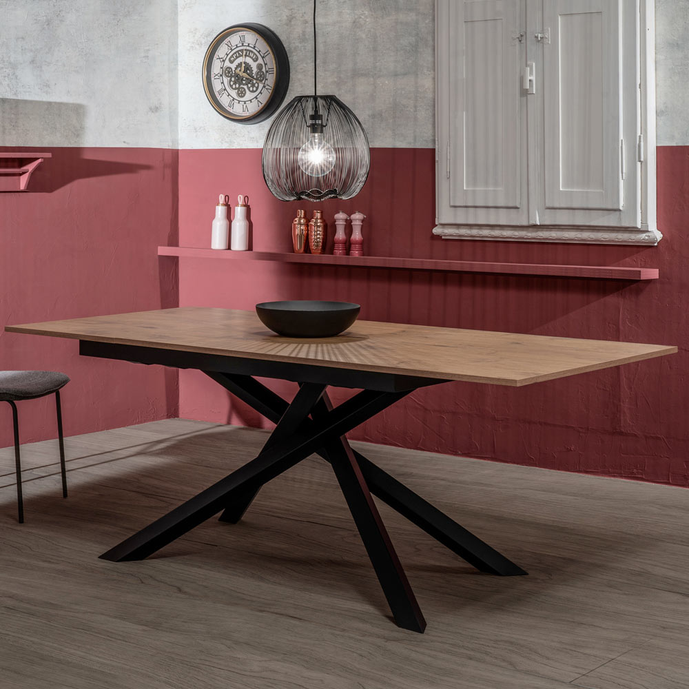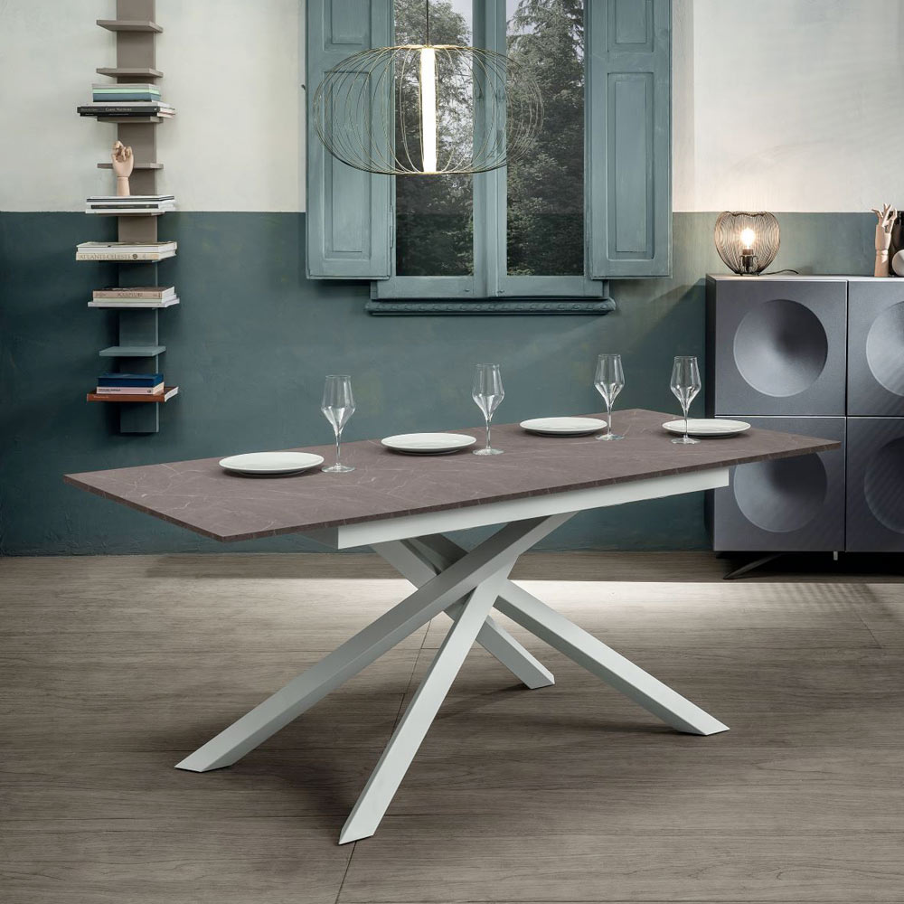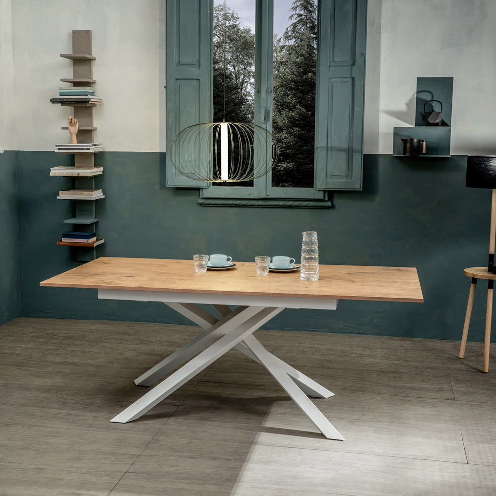 Design rozkládacího stolu přesahuje funkční hledisko a díky své základně s propracovaným tvarem, která upoutá pozornost, dokáže dodat prostorům jedinečný charakter. Nachází se v obývací části v moderním stylu, který upřednostňuje minimální linie, pojme až 8 osob a vytváří místo pro setkávání, kde můžete trávit čas s rodinou nebo přáteli. Tento jídelní stůl se stává nesporným hrdinou obývacího pokoje, který odráží styl a osobnost domu.