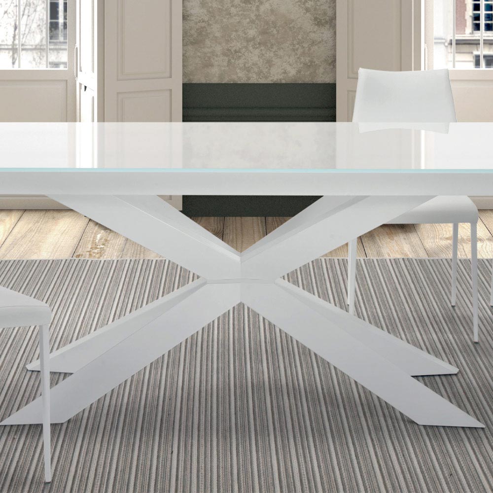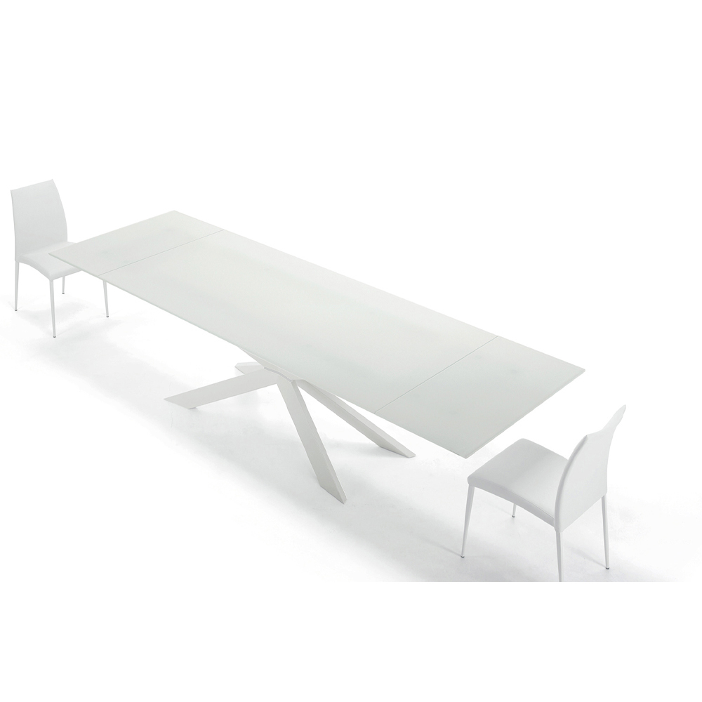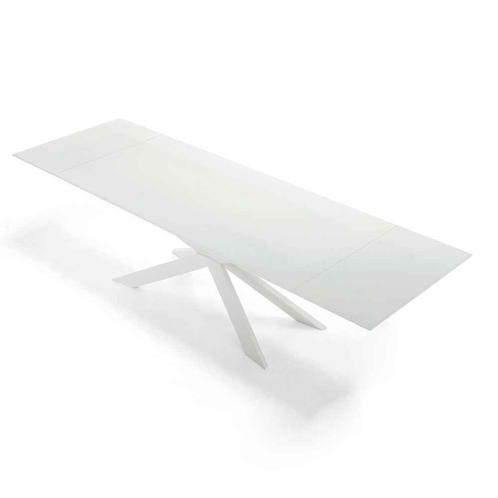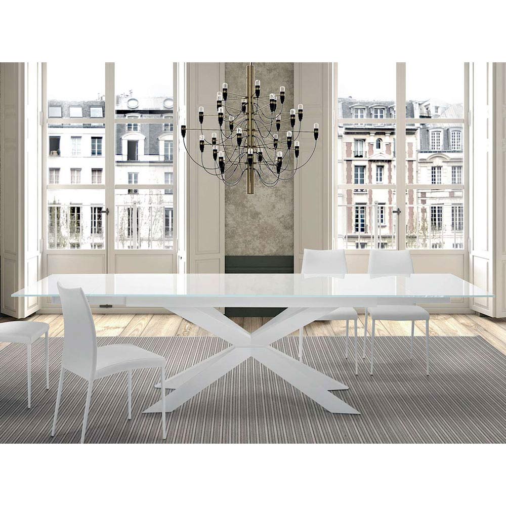 Moderní stůl rozkládací až na 278 cm s deskou z tvrzeného skla a podnoží z bílé oceli, vyrobený v Itálii.