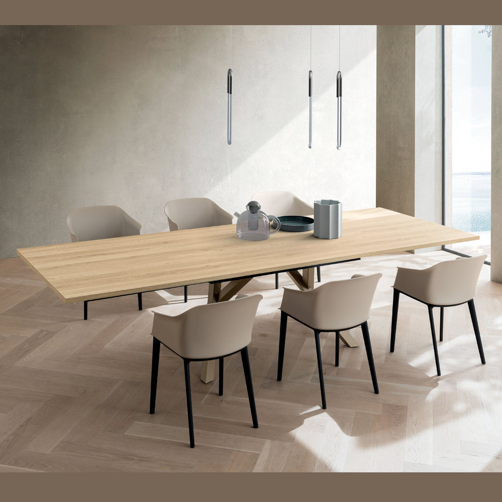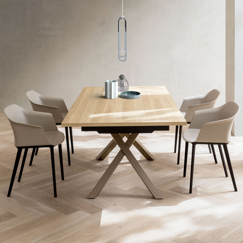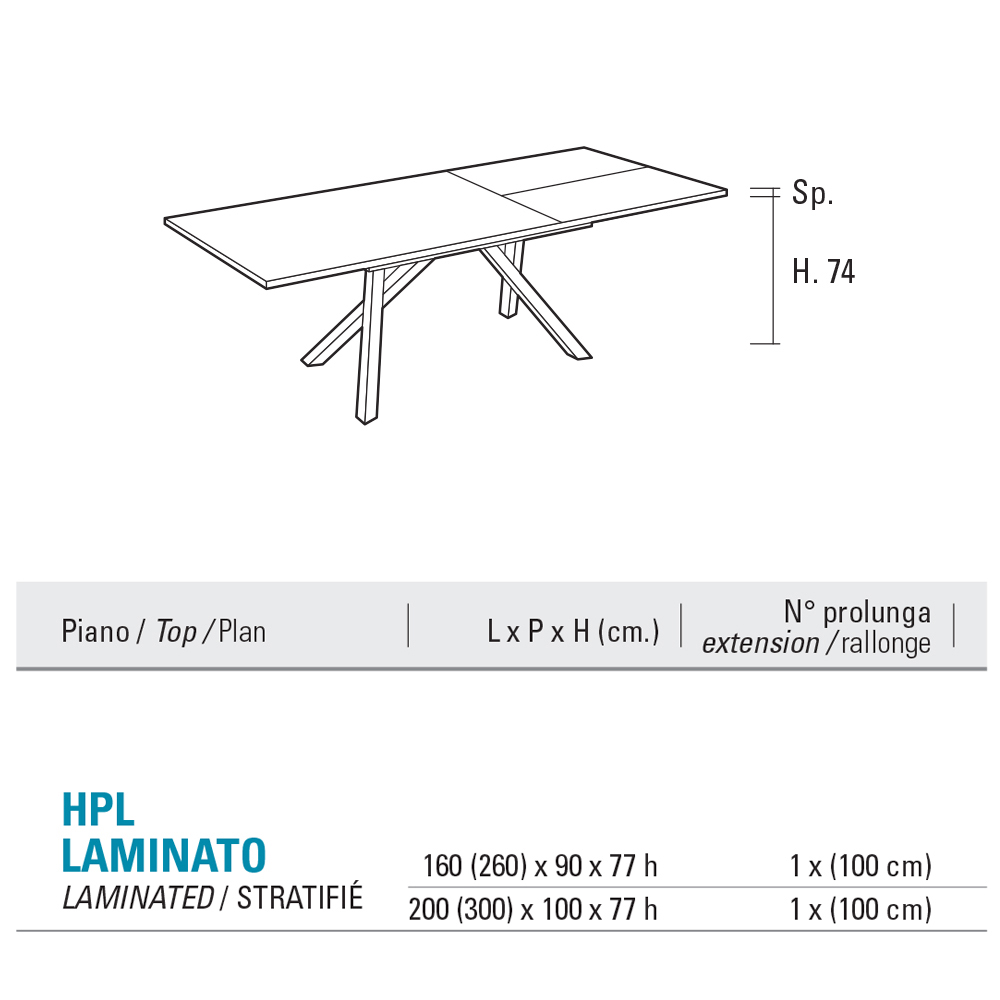 Vrchní deska z HPL je ideální pro každodenní použití bez kompromisů v estetickém provedení. Díky integrovanému výsuvnému mechanismu se stůl snadno rozloží a pohodlně pojme více hostů, čímž se stane perfektním protagonistou rodinných obědů a večeří s přáteli.