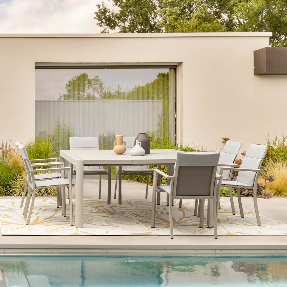 Tento zahradní stůl je skutečným klenotem minimalistického a funkčního designu . Jeho vysoce kvalitní hliníkový povrch vyznačující se čistými liniemi evokuje moderní a sofistikovaný styl, který nezůstane bez povšimnutí. Díky neutrálním barvám je mimořádně univerzální a hodí se do jakéhokoli venkovního prostředí, od městského balkonu až po terasu venkovské vily. Nejen esteticky, ale také extrémně praktické a odolné ; Tento stůl je vyroben tak, aby odolal přírodním živlům a zajistil dlouhou životnost a stabilitu . Díky svým jednoduchým liniím a elegantní siluetě se tento stůl stává protagonistou každé veselé venkovní chvíle a nabízí maximální pohodlí a pohostinnost . Tento zahradní stůl je výrazem čistého současného stylu a je ideální volbou pro ty, kteří rádi vítají, žijí a sdílejí svůj život pod širým nebem s třídou a jednoduchostí .