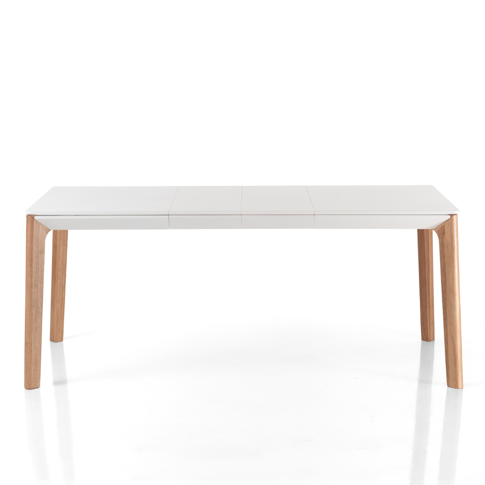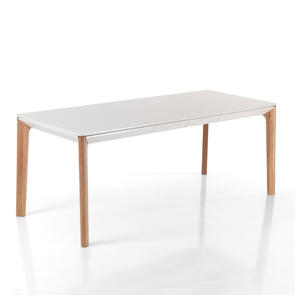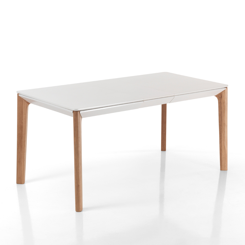 Rozkládací vnitřní stůl s 8,5 cm silnou deskou z matně bílé lakované MDF desky, podnoží z
