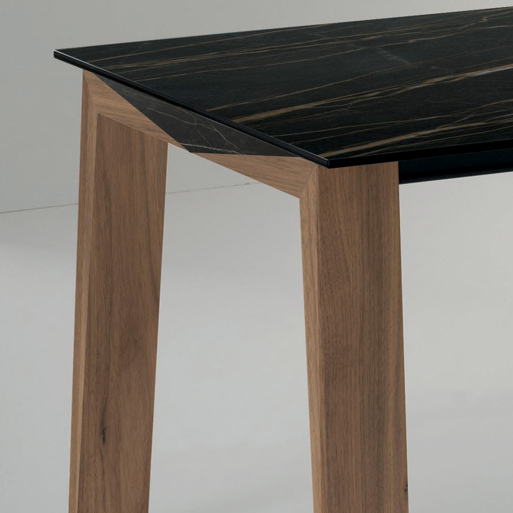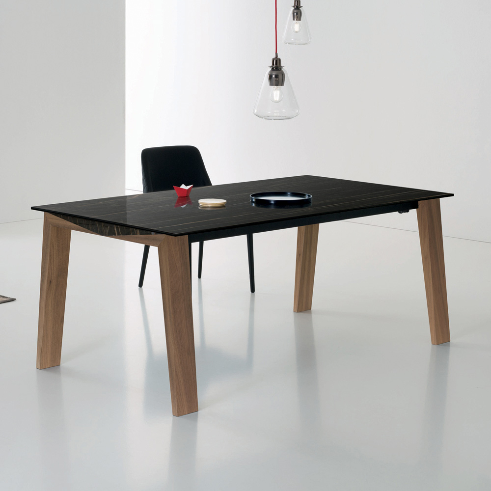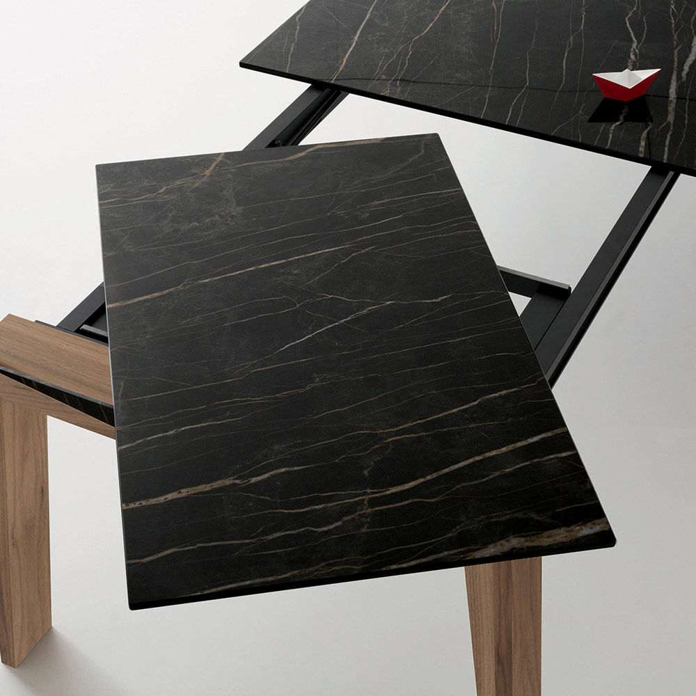 Rozkládací jídelní stůl z masivního dřeva a lesklé keramické desky, vyrobený v Itálii.