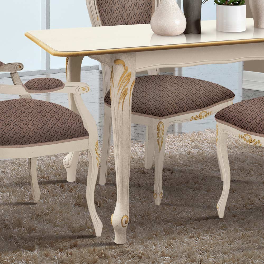 Rozkládací stůl do jídelny klasického stylu vyrobený v Itálii v bílém dřevě se zlatými detaily. Stůl má dva vnitřní nástavce po 40 cm, které umožňují jeho prodloužení ze 140 na 220 cm.