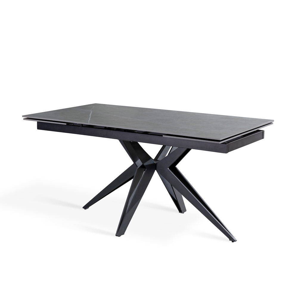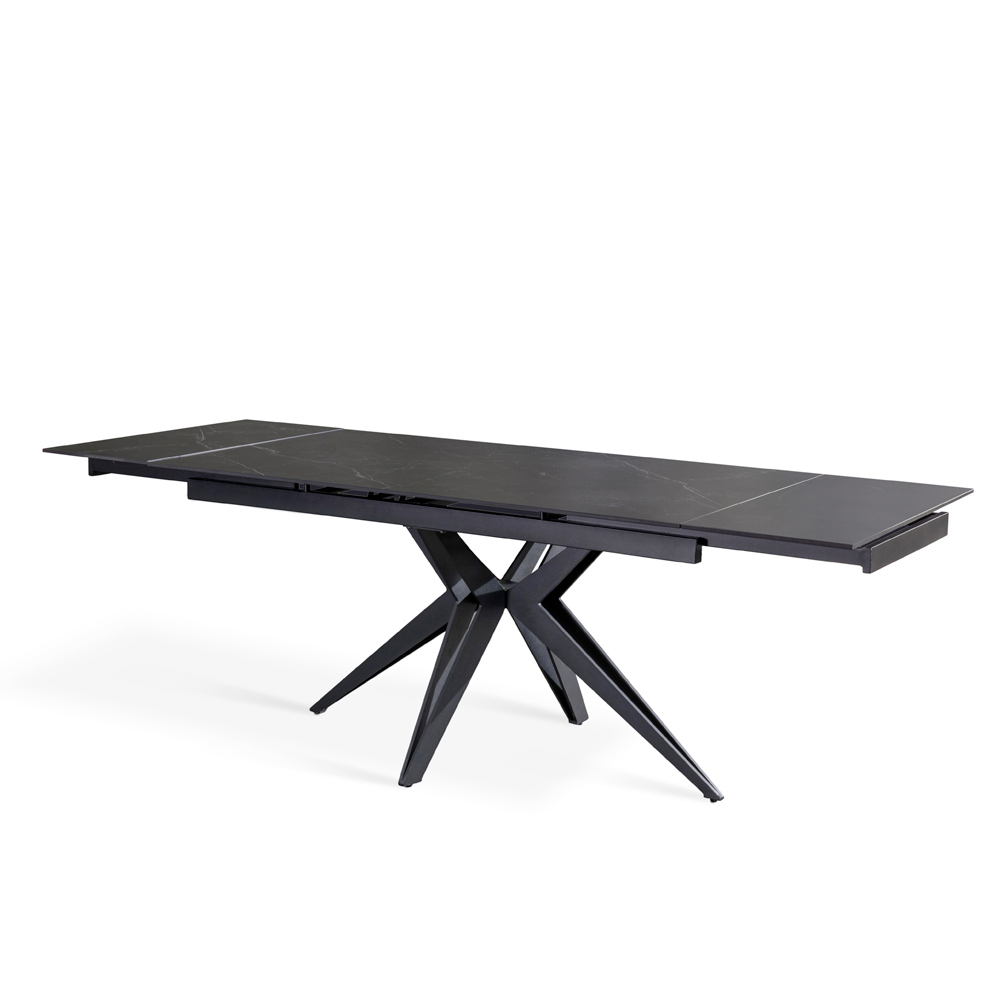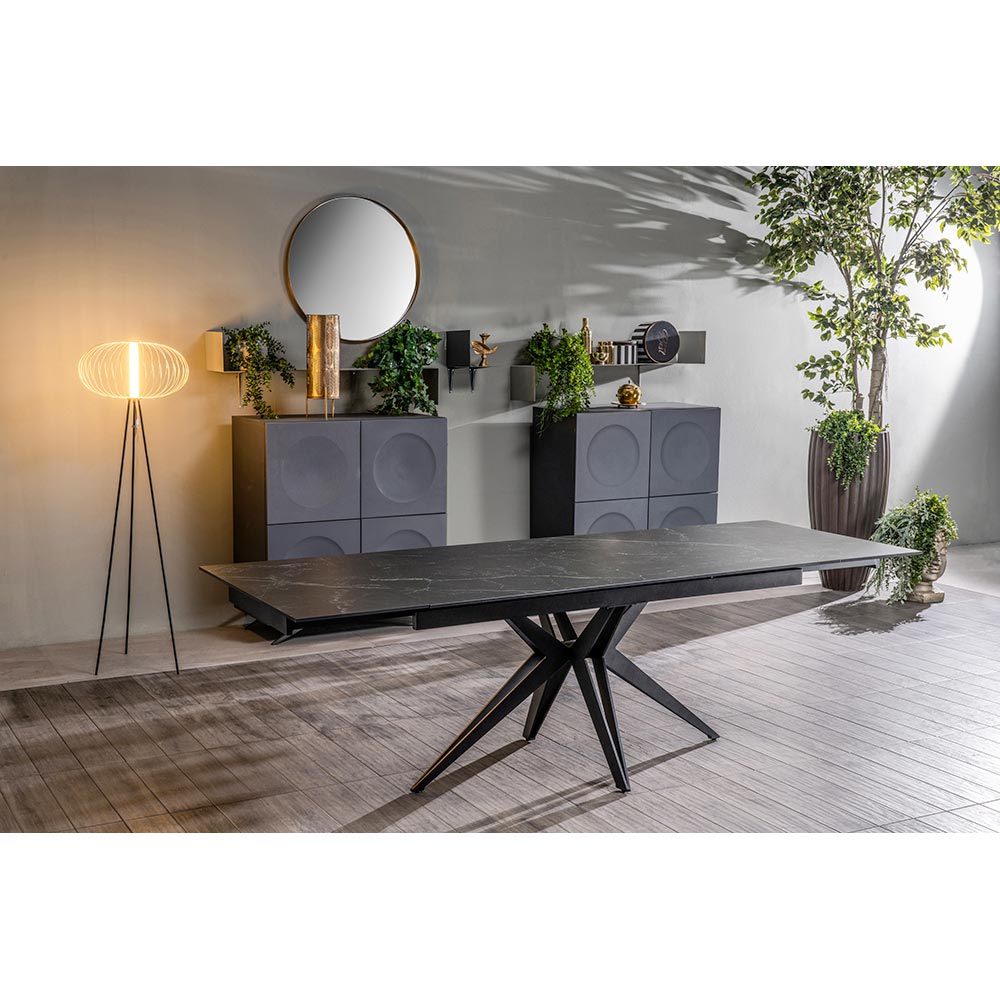 Co přitahuje pozornost, je expresivní síla tohoto rozkládacího stolu v současném a industriálním stylu. Jeho design se vyznačuje elegantní deskou z keramiky, která vkusně ladí s pevnou kovovou základnou. Nabízí mnoho možných kombinací mezi povrchovou úpravou obdélníkové desky a povrchovou úpravou základny, uspokojující osobní výraz a vkus a odrážející ducha kontextu, do kterého je vložena. Díky své rozšiřitelnosti pojme až 10 osob a stává se dokonalým spojencem při vytváření jedinečných a teplých společenských prostor.