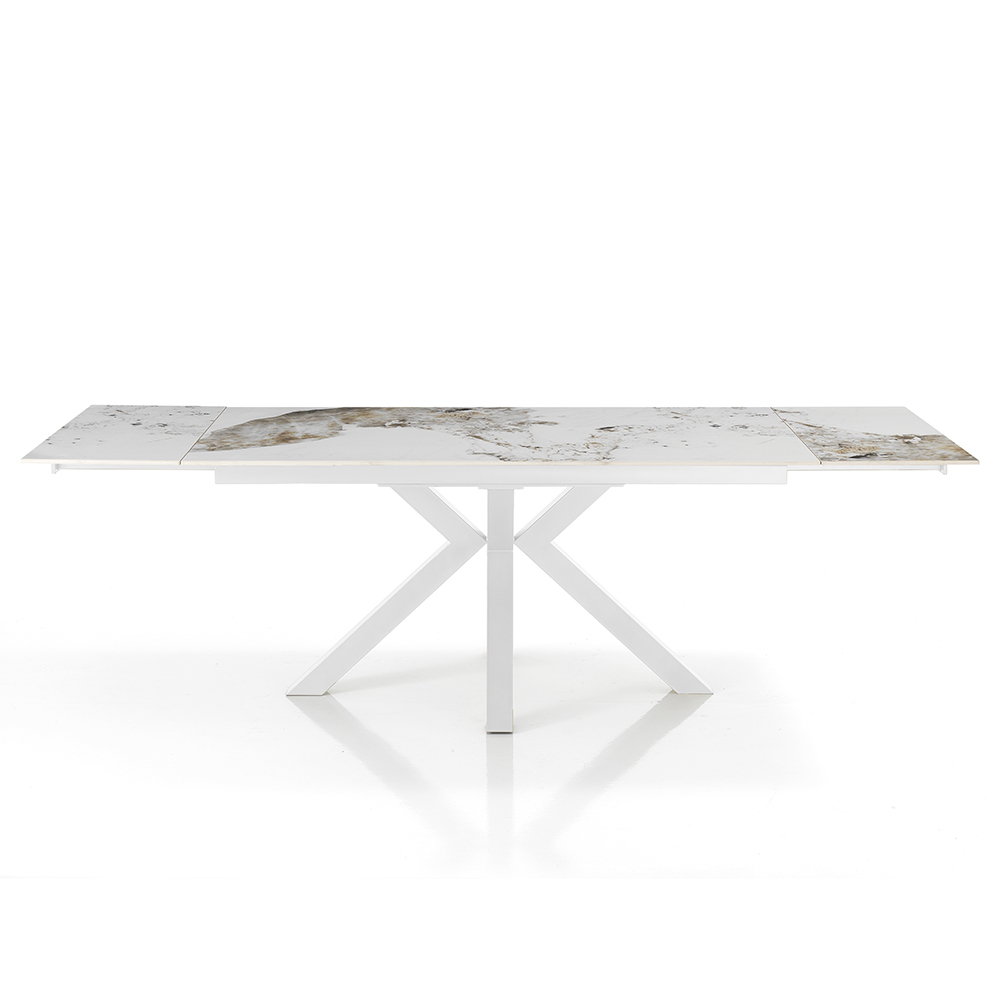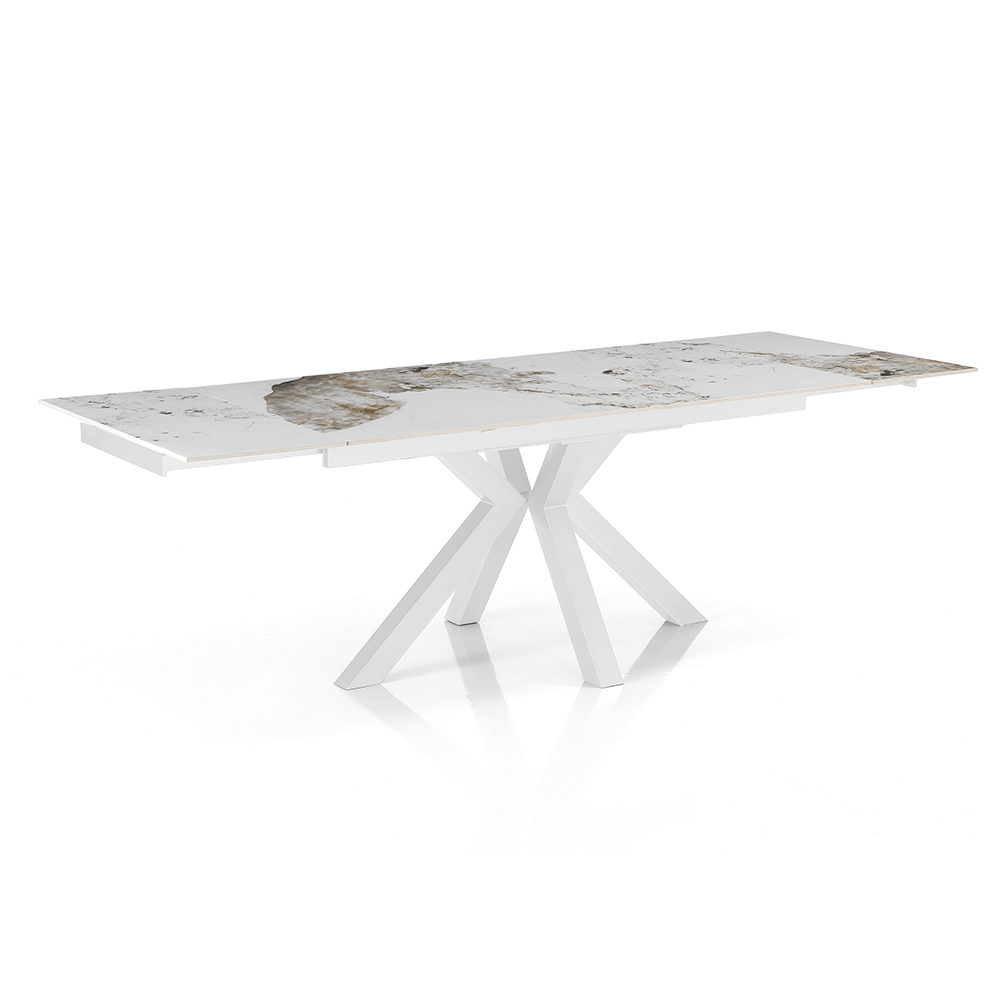 Tento rozkládací stůl je mistrovským dílem současného designu, který kombinuje eleganci a funkčnost v jediném kusu luxusního nábytku. Stolní deska vyrobená z keramiky s mramorovým efektem se vyznačuje složitým žilkováním, které dodává každému kusu jedinečnost a osobitost.