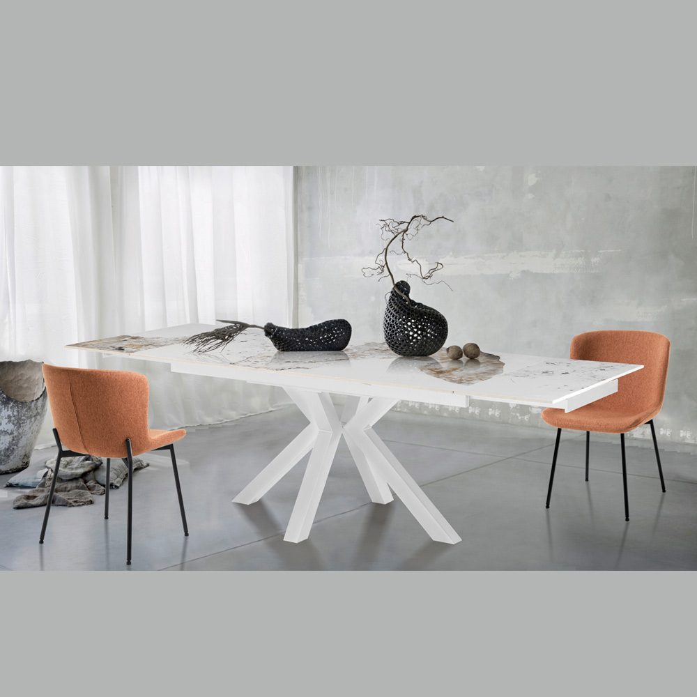 Základna stolu z bílého lakovaného kovu se vyznačuje konstrukcí ve tvaru X, která nejen zaručuje stabilitu a podporu, ale také dodává celku sochařský designový prvek. Tato kombinace materiálů zajišťuje nejen trvanlivost a odolnost v průběhu času, ale také vizuálně působivý dotek, který může proměnit každou jídelnu nebo zasedací místnost.