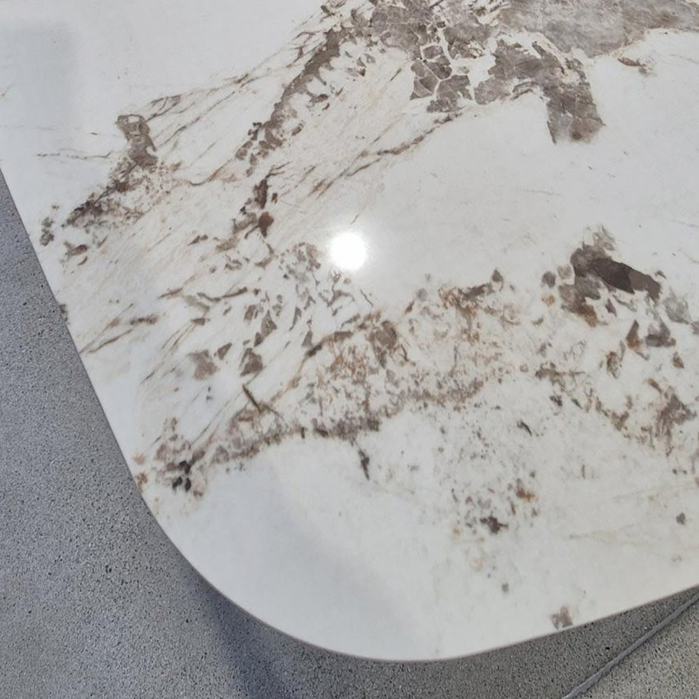 Tento stůl z kameniny a kovu kombinuje moderní design a trendy materiály a vytváří tak vizuálně působivý kus nábytku. Kameninová deska s mramorovým efektem , přirozenou texturou a lesklou povrchovou úpravou dodává každému prostoru vytříbenou, moderní eleganci. Tkaná kovová základna se svými plynulými, dynamickými tvary se stává skutečným sochařským prvkem stolu: pevná, ale zároveň křivolaká, dodává celé konstrukci rovnováhu a osobitost.