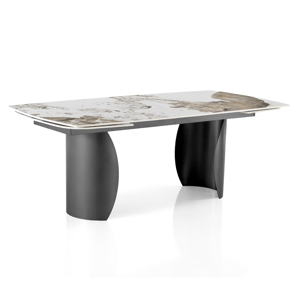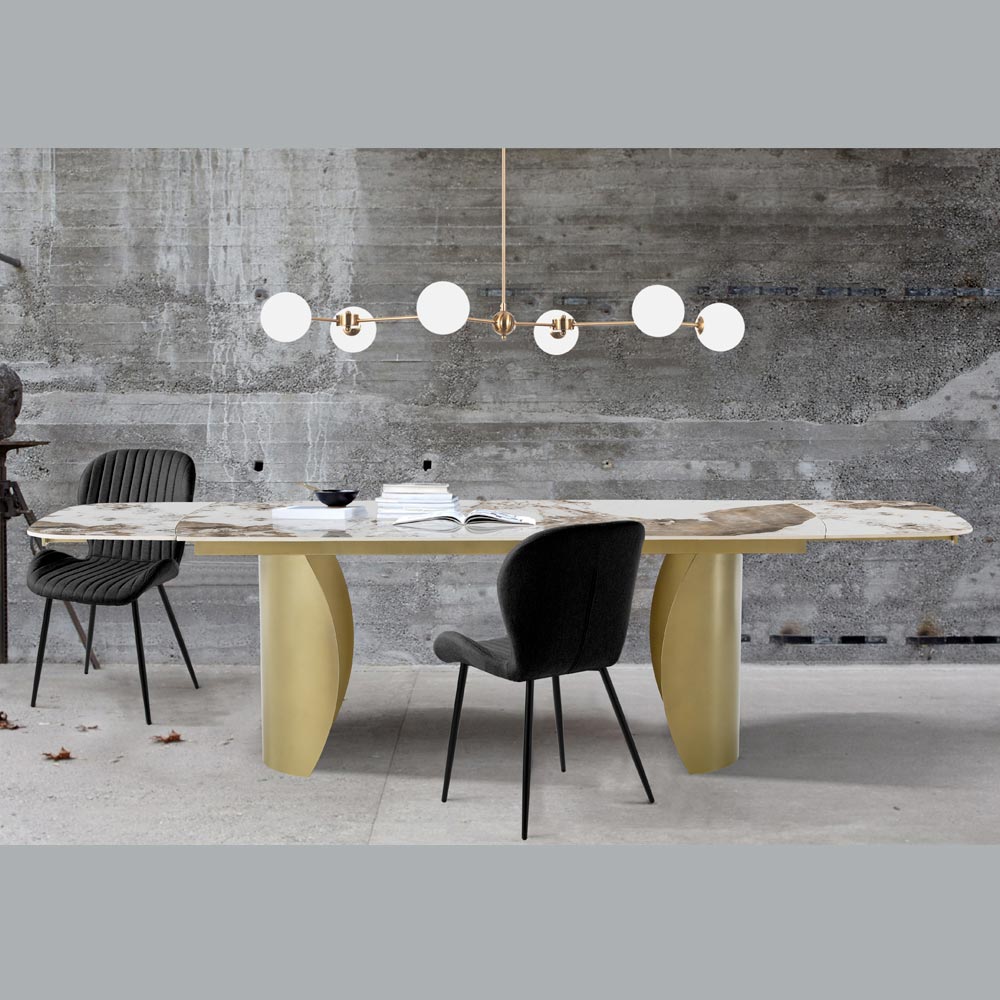 Tento rozkládací stůl je vznešeným vyjádřením luxusu a funkčnosti . Keramická deska s mramorovým efektem, charakteristická složitým vícebarevným žilkováním, spočívá na dvojité základně, která nejenže poskytuje stabilitu, ale dodává nádech sofistikované elegance .