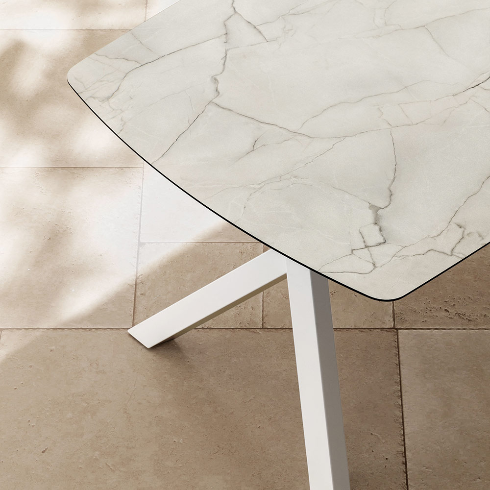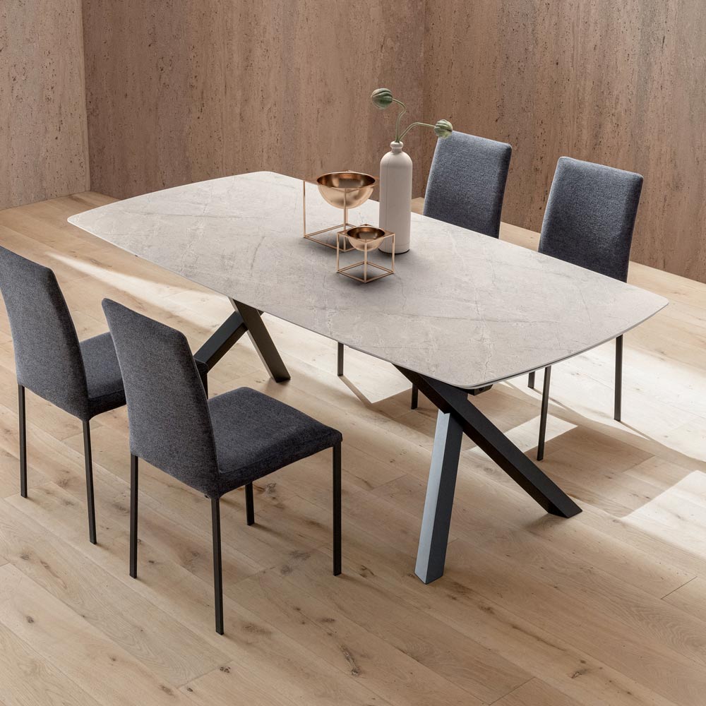 Lakovaná kovová konstrukce se zkříženými nohami s výrazným vizuálním dojmem dodává stolu stabilitu, robustnost a architektonický styl , díky čemuž je ideální pro moderní, elegantní a otevřená prostředí.