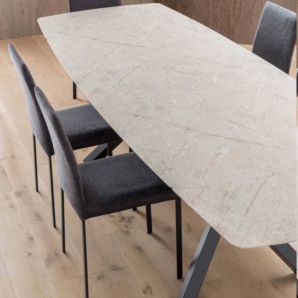 Díky integrovanému systému s bočními výsuvy se stůl snadno rozkládá, což zajišťuje maximální flexibilitu při každé příležitosti, od každodenních obědů až po schůzky s mnoha hosty.