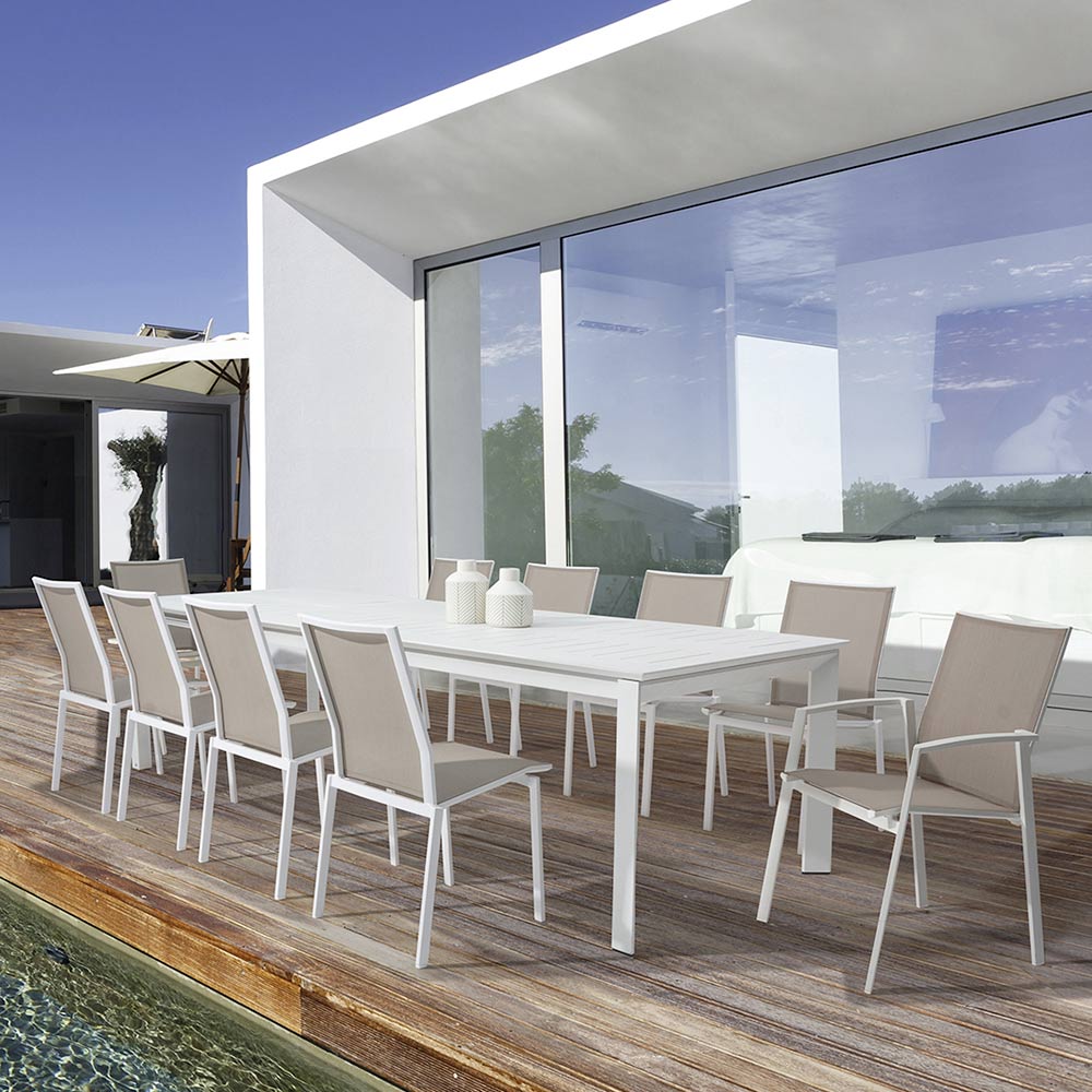 Rozkládací venkovní stůl pro 10 osob, moderní design, v rastrovém, antracitovém nebo bílém hliníku.