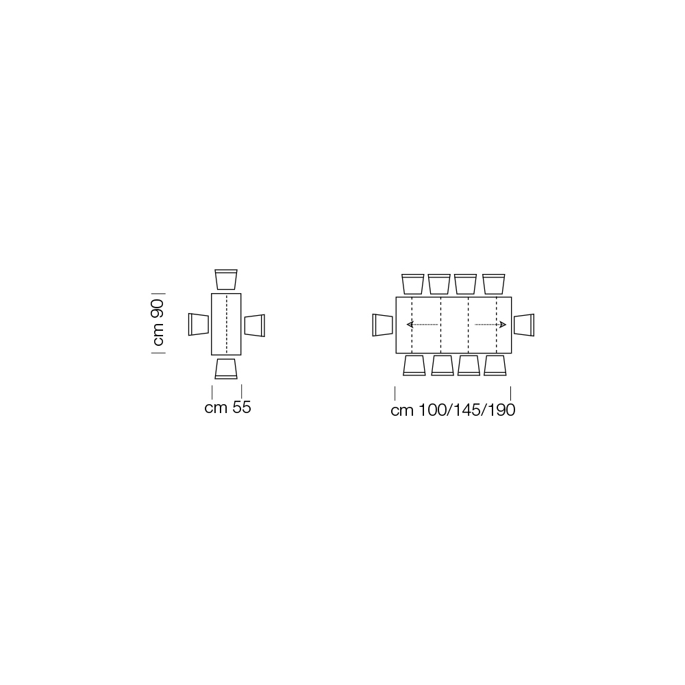 - L 55 (190) x H 120 x V 77 cm 12místný rozkládací se třemi vnějšími prodlouženími, každý o délce 45 cm.