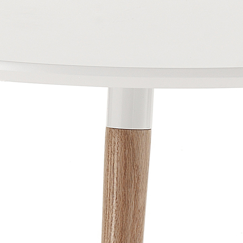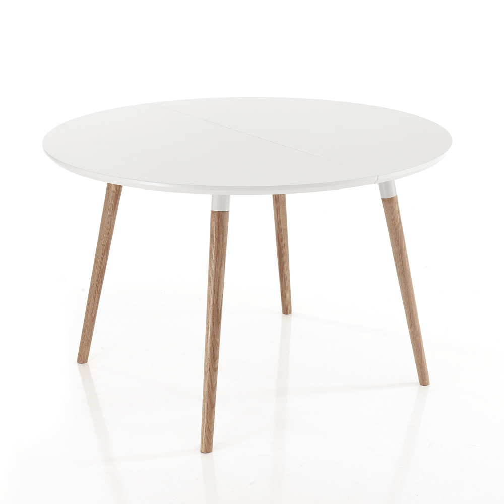 Kulatý jídelní stůl s deskou z matně bílé lakované mdf a nohami z masivního dřeva s dubovou úpravou . Výrobek s jednoduchým a čistým designem, ideální pro ty, kteří milují zásadní a všestranný styl nábytku, který dokáže vkusně a osobitě dotvořit styl jejich jídelny nebo kuchyně. Jeho silnou stránkou je prodlužovací top, který díky dvěma prodloužením po 50 cm dosahuje délky 170 nebo 220 cm.