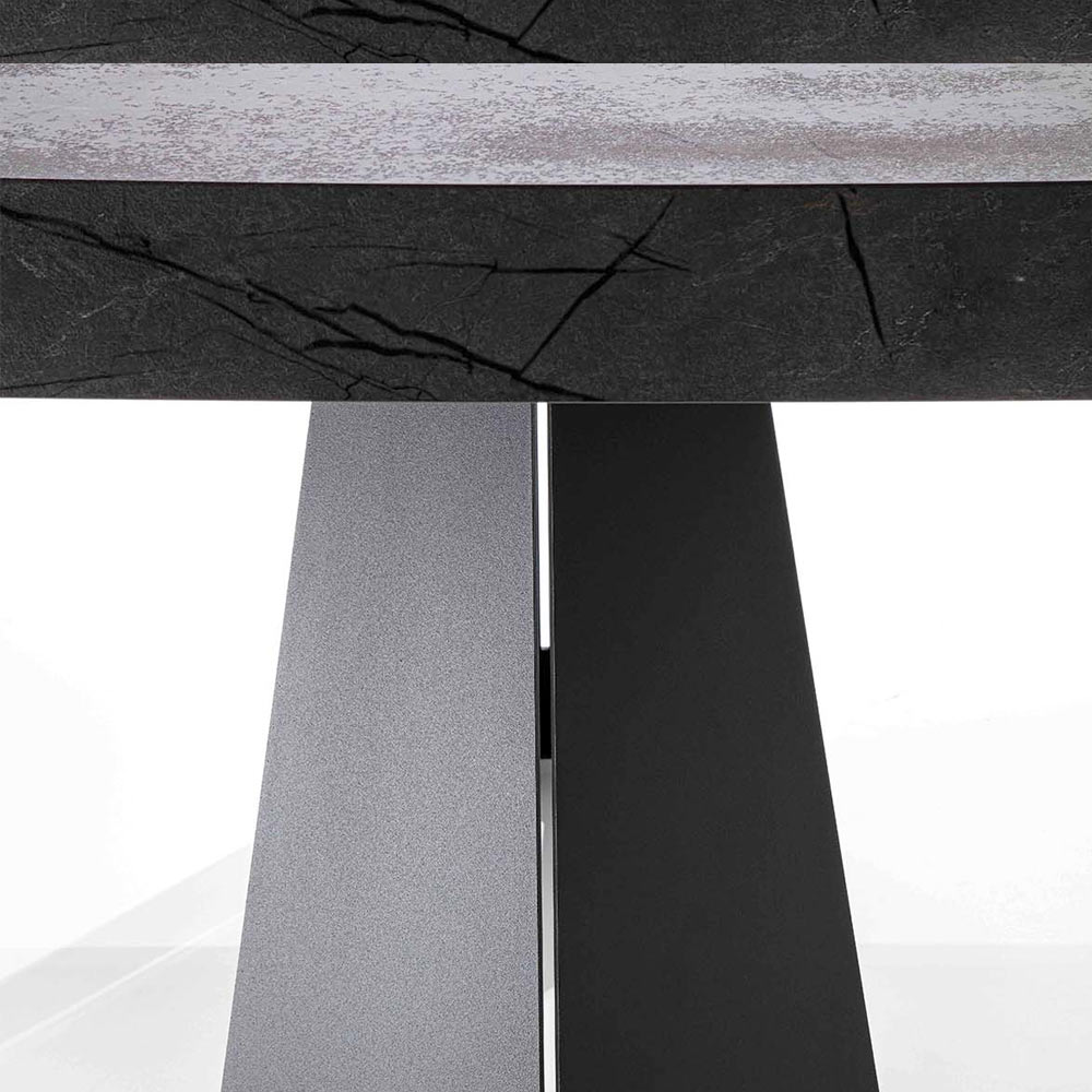 Jeho design je jedinečný a avantgardní díky zvláštnímu černému podstavci, který díky svým neobvyklým liniím obohacuje jeho estetiku a zvyšuje jeho silný charakter, což z něj činí dokonalý jídelní stůl schopný dotvořit zařízení stylového prostředí. moderní a rafinované. Různé povrchové úpravy dostupné pro horní část také umožňují ještě více zvýšit její