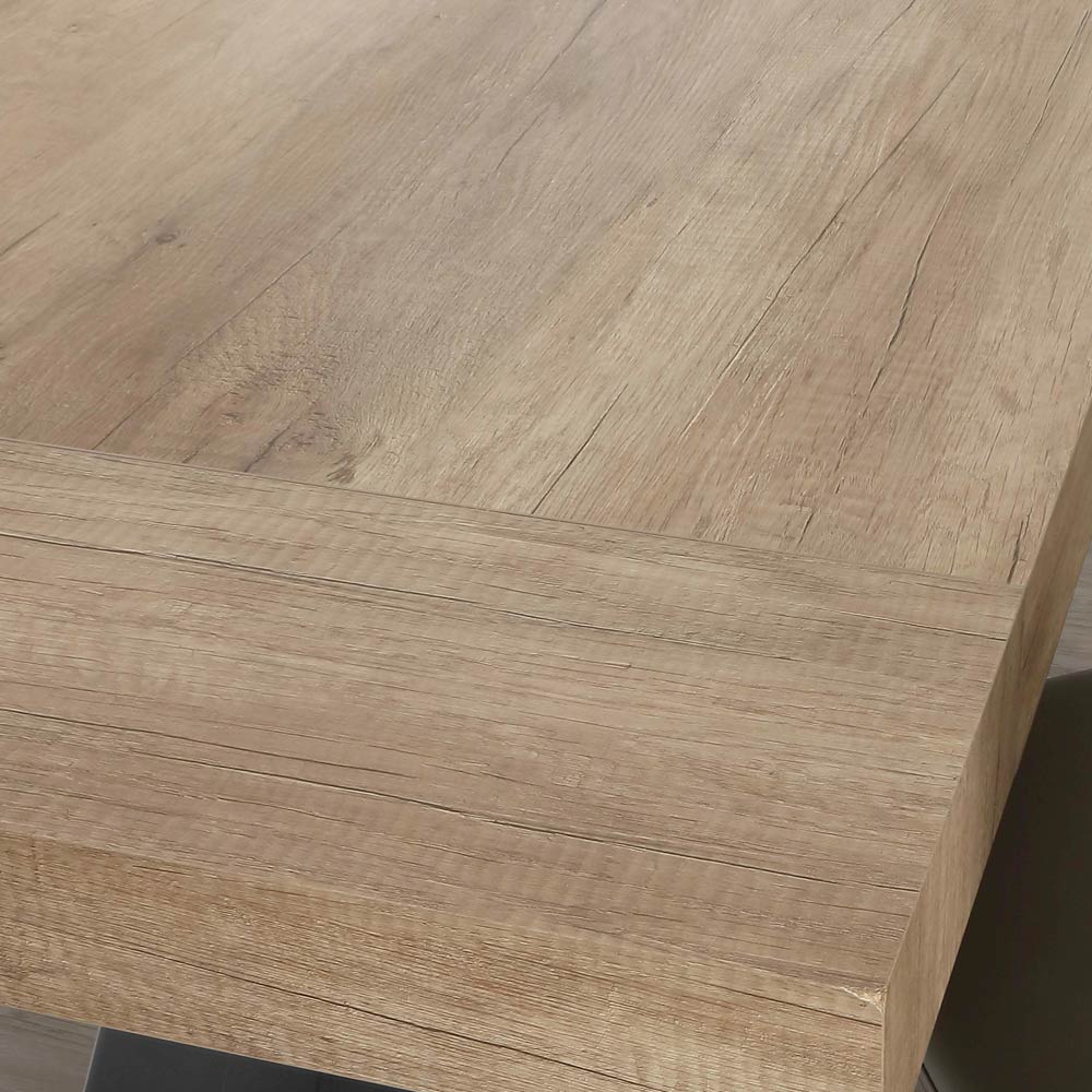 melaminového dřeva lze rozložit až na maximální délku 260 cm díky odpovídajícím nástavcům umístěným pod deskou. Právě pro tuto vlastnost je schopen pojmout větší počet hostů, kteří se otevírají extrémně jednoduchým způsobem a umožňují stejně snadné zavření po skončení jídla. Jeho design proto kombinuje