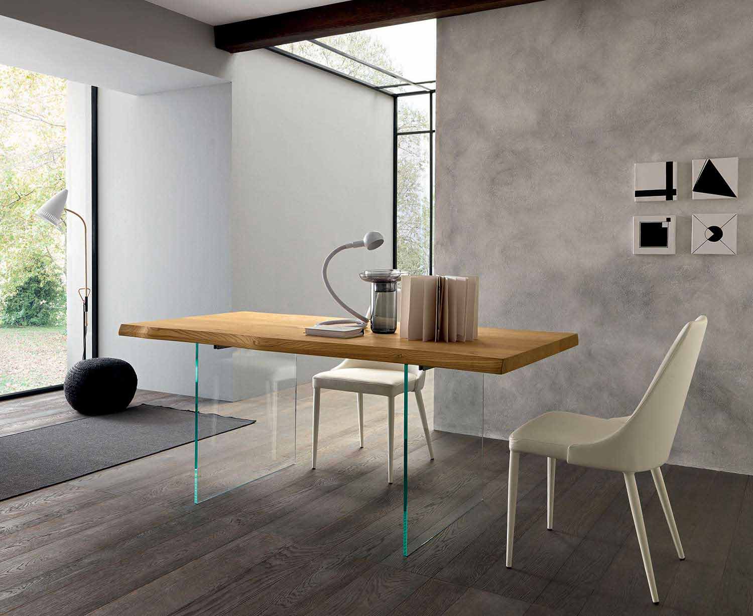 průhledných skleněných nohách , díky nimž se dřevěná deska jakoby vznáší se silnou přírodní referencí a
